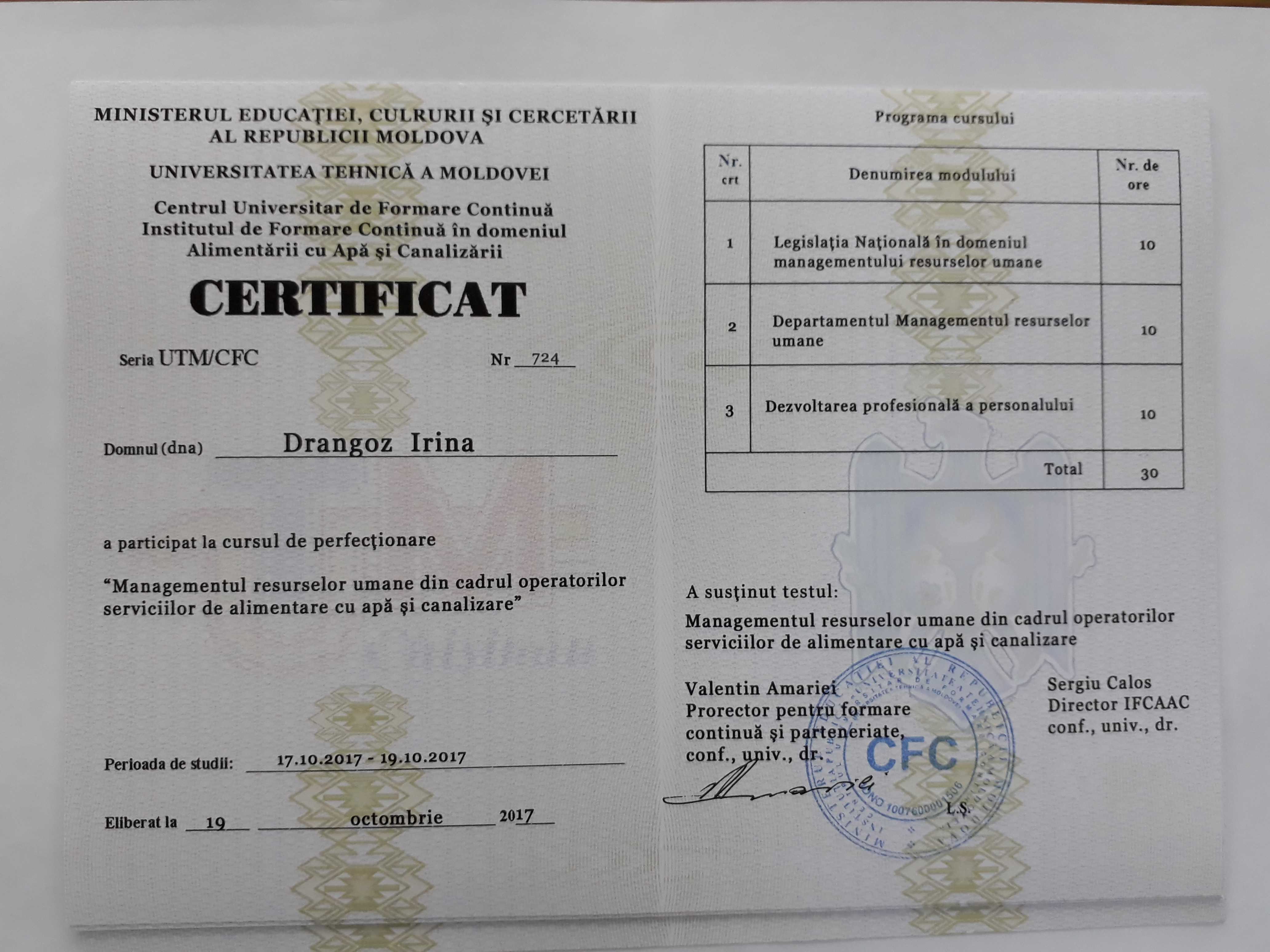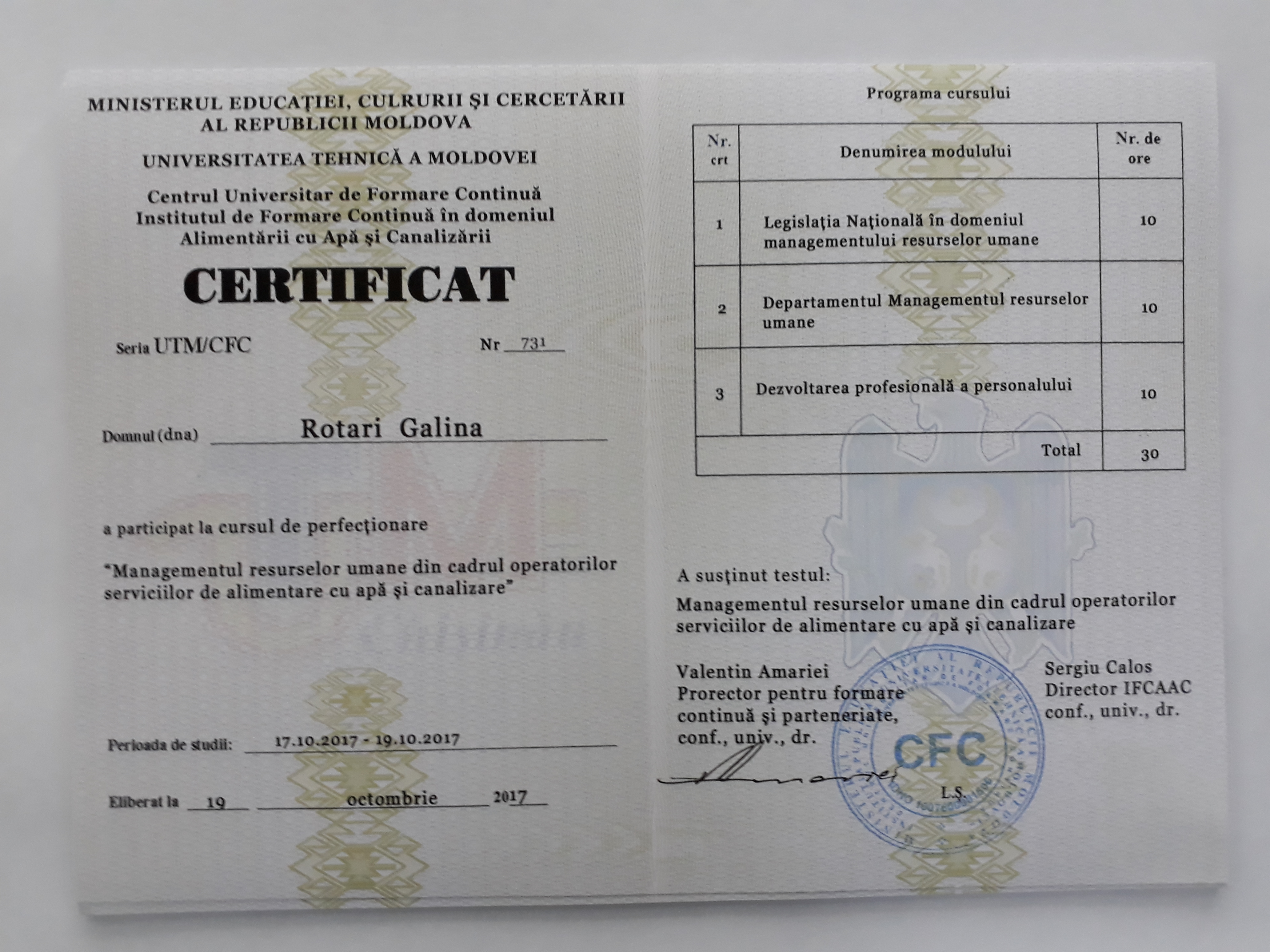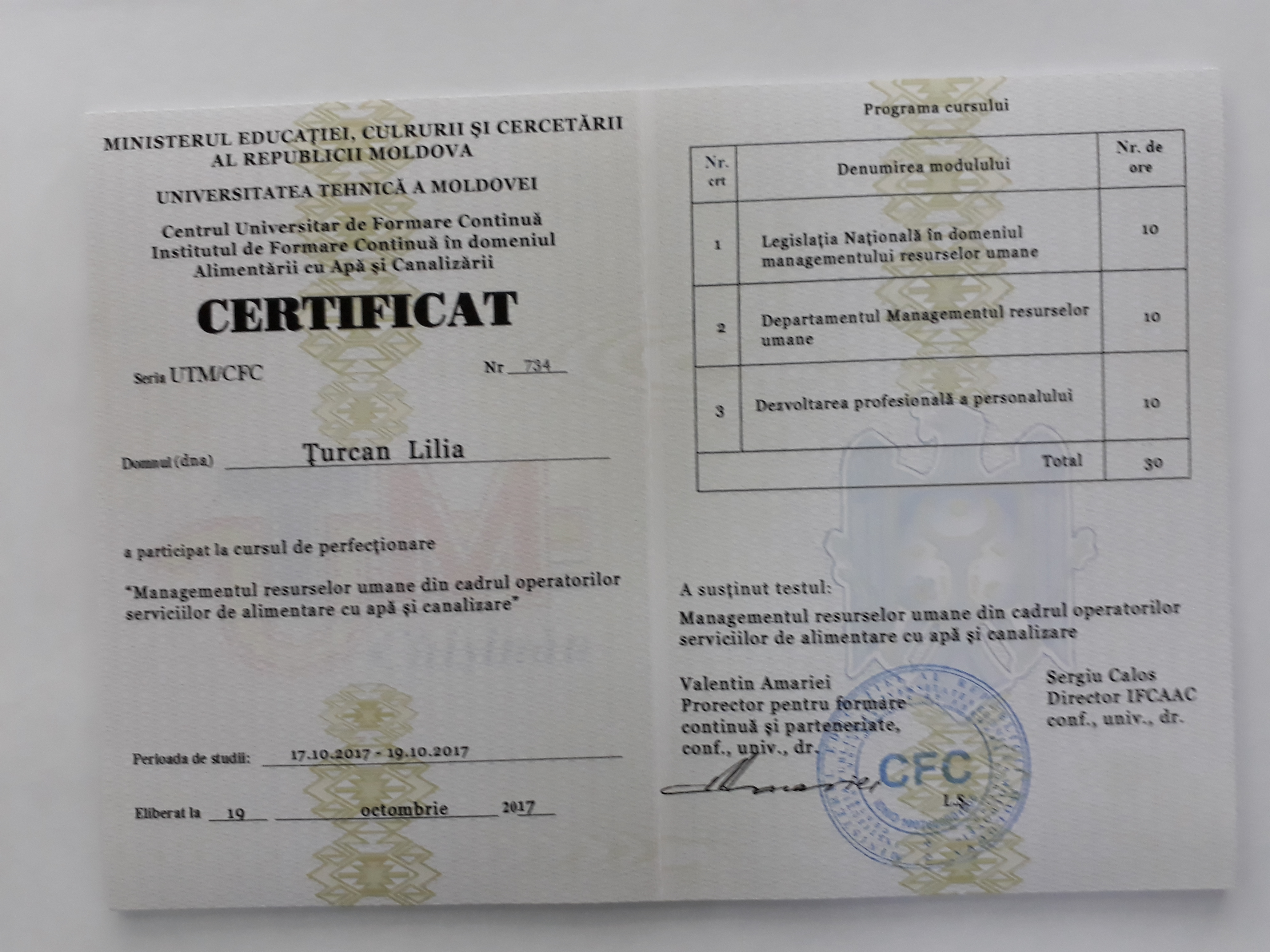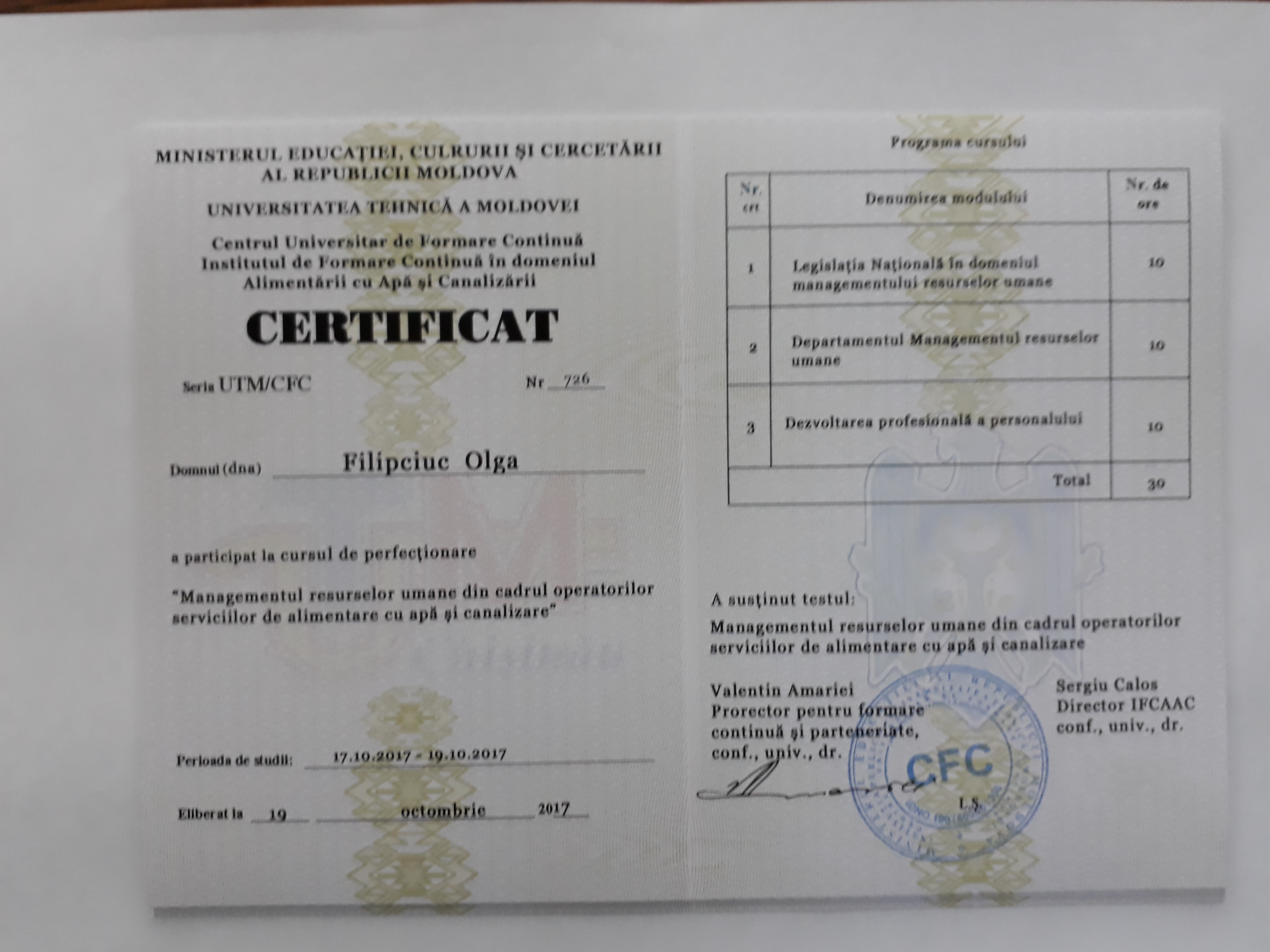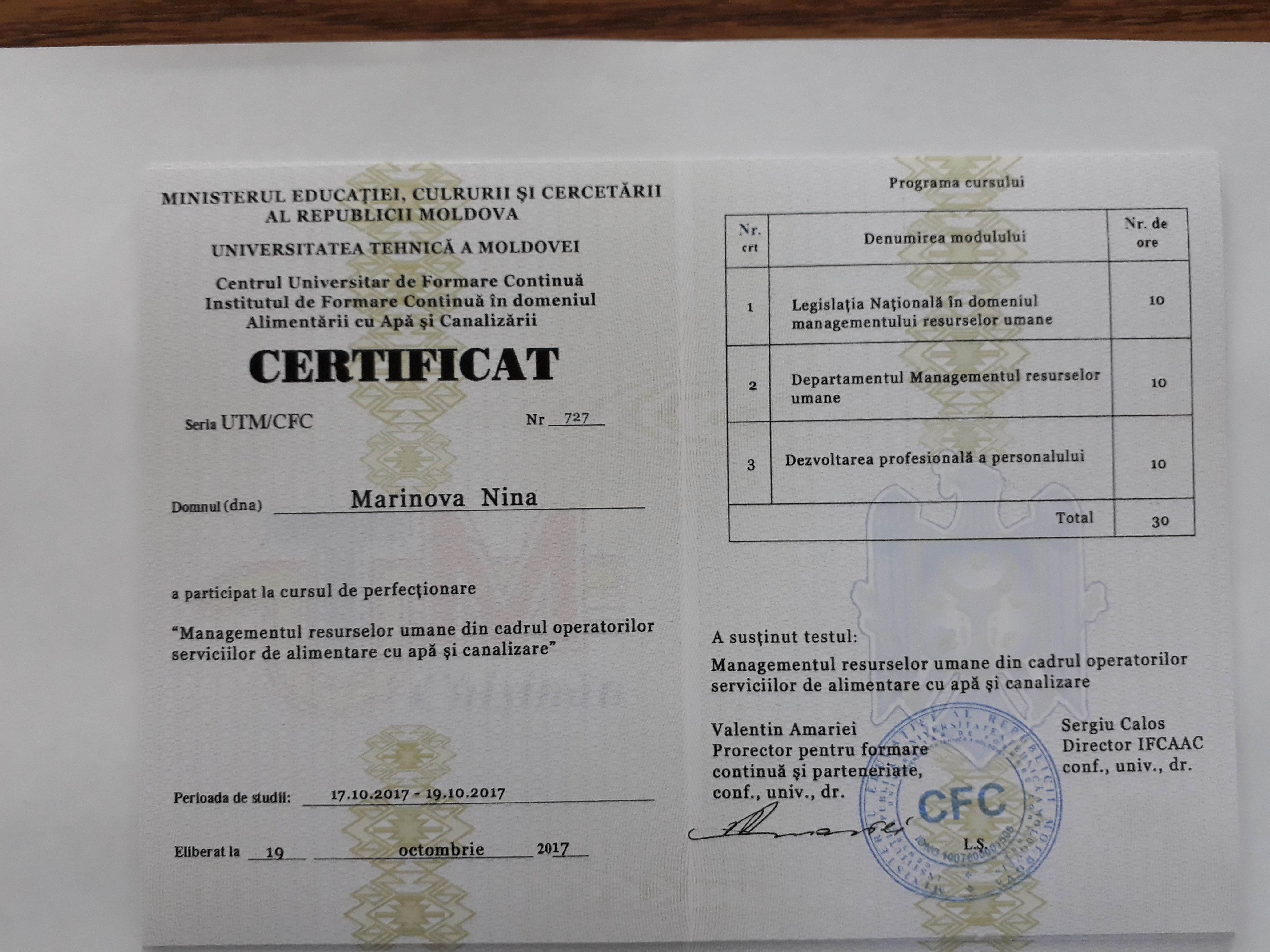 Direcția executivă a Asociației Moldova Apă-Canal (AMAC) în colaborare cu Institutul de Formare Continuă în domeniul Alimentării cu Apă și de Canalizare pentru membri AMAC (IFCAAC), cu suportul financiar al Agenției de Cooperare Internațională a Germaniei (GIZ), în perioada 17-18-19 octombrie 2017, a organizat cursul de instruire pentru Modulul 12: Managementul resurselor umane în cadrul operatorilor serviciilor de alimentare cu apă și de canalizare. Grupul 2 (limba rusă).