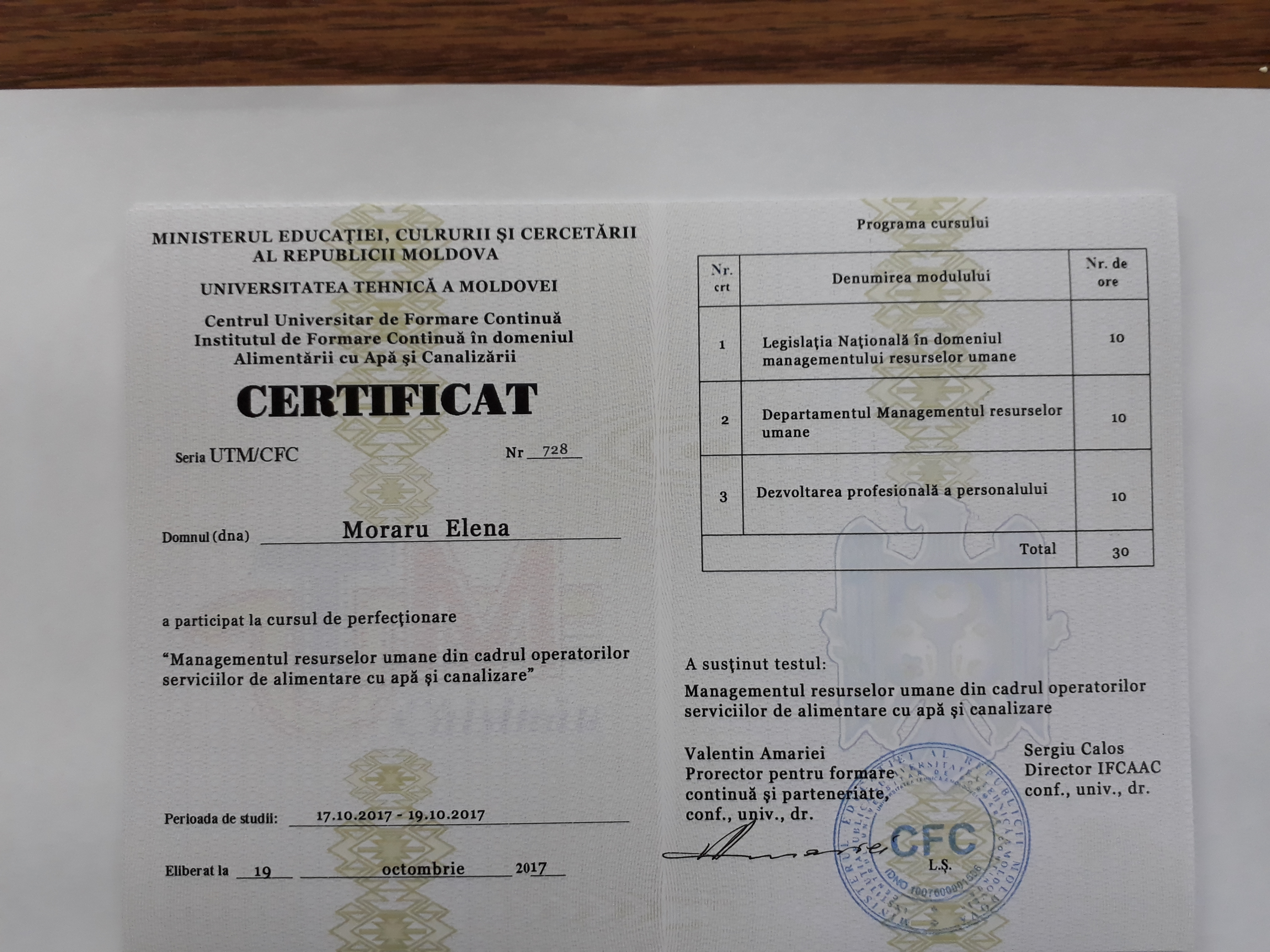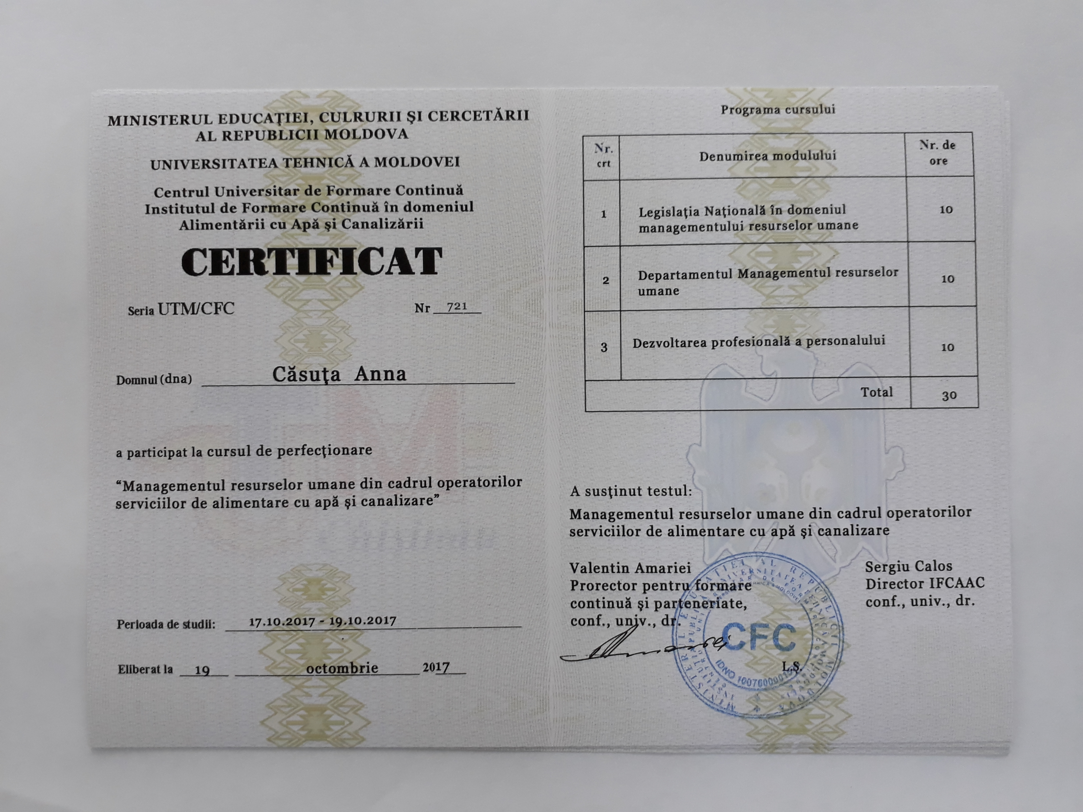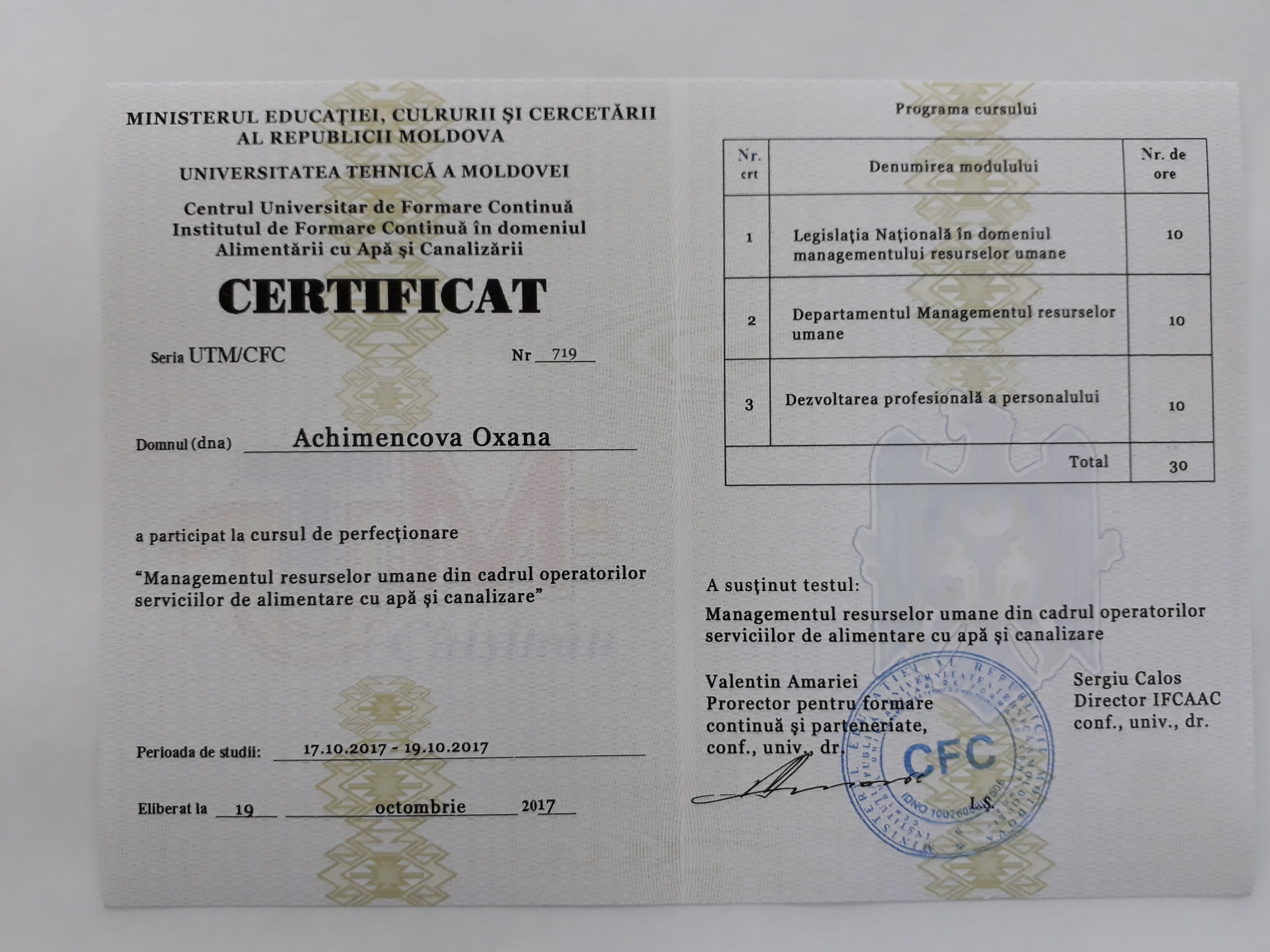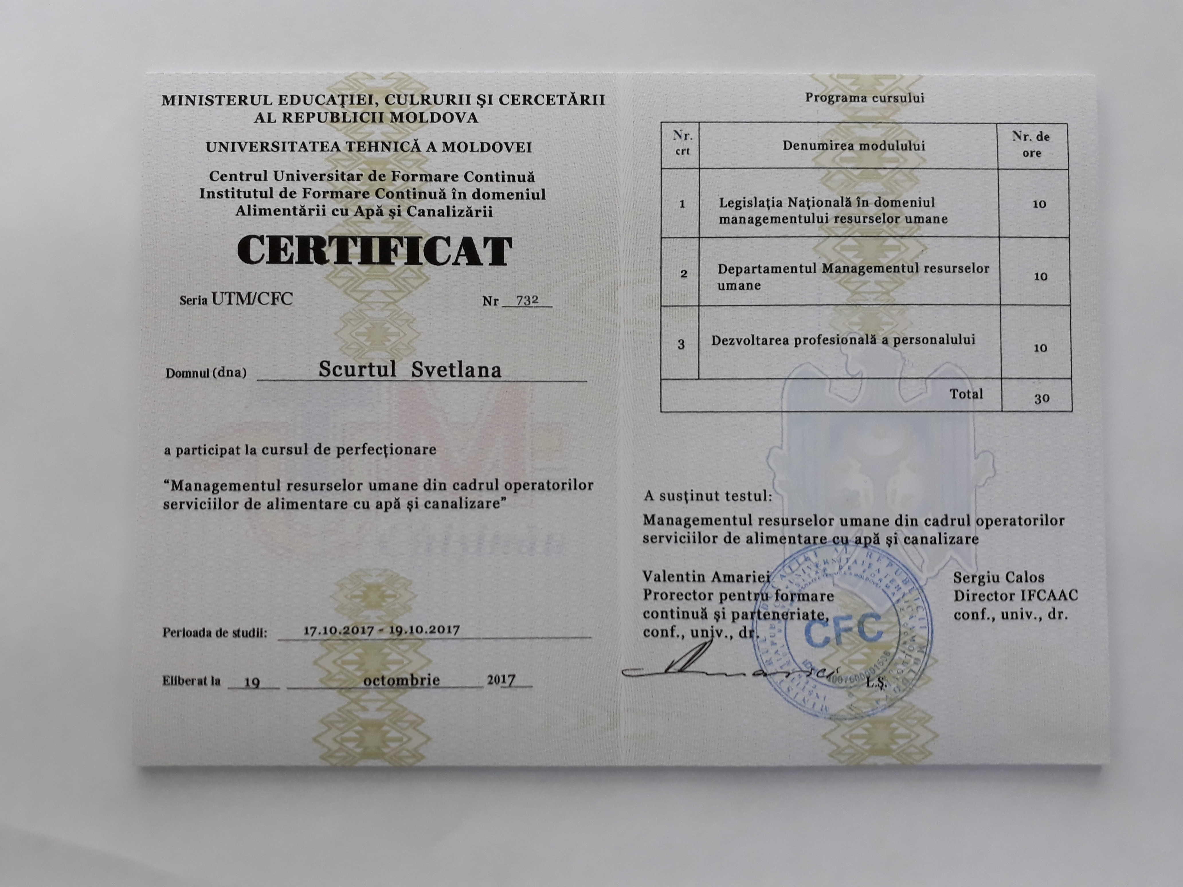 Direcția executivă a Asociației Moldova Apă-Canal (AMAC) în colaborare cu Institutul de Formare Continuă în domeniul Alimentării cu Apă și de Canalizare pentru membri AMAC (IFCAAC), cu suportul financiar al Agenției de Cooperare Internațională a Germaniei (GIZ), în perioada 17-18-19 octombrie 2017, a organizat cursul de instruire pentru Modulul 12: Managementul resurselor umane în cadrul operatorilor serviciilor de alimentare cu apă și de canalizare. Grupul 2 (limba rusă).