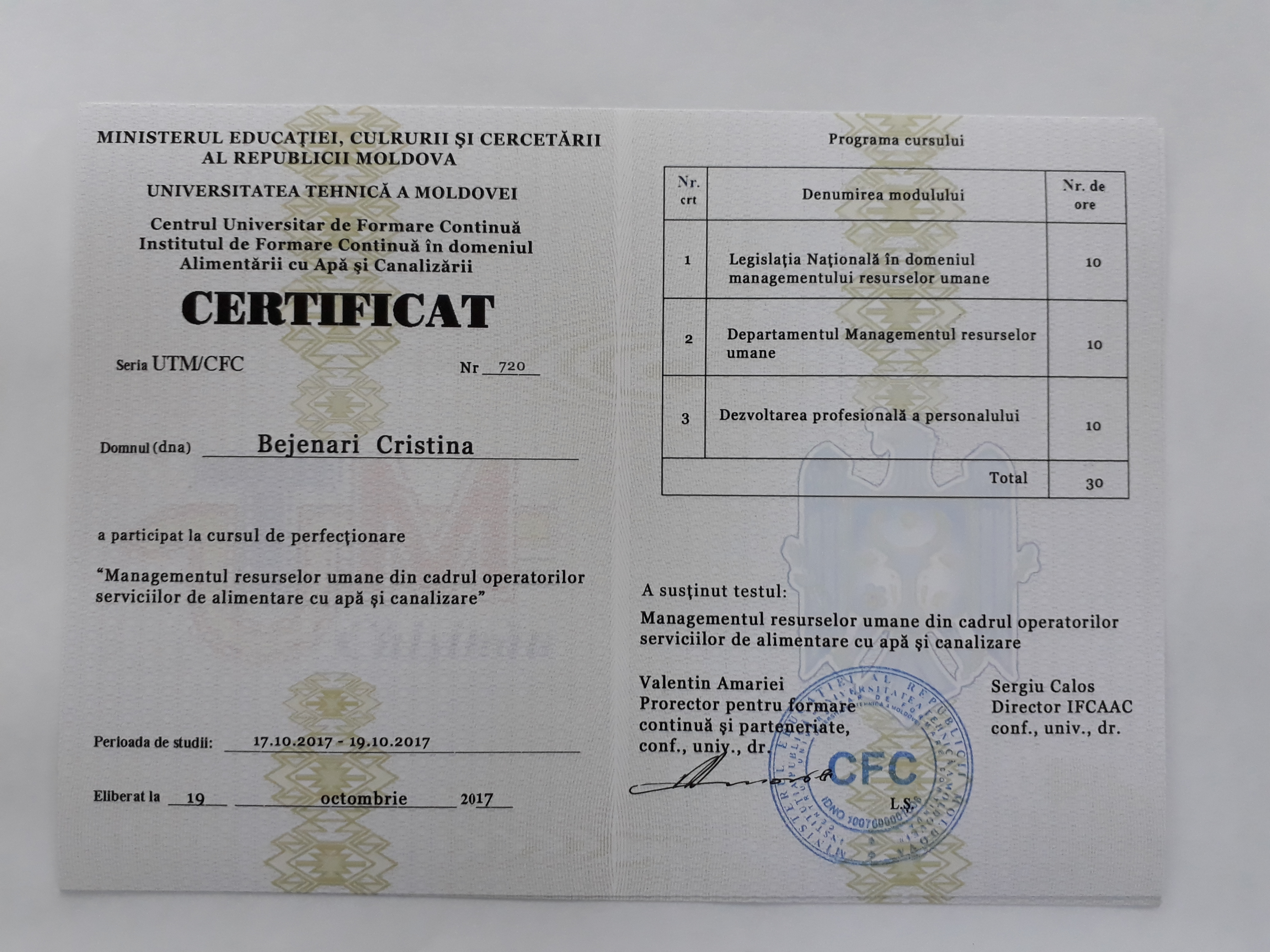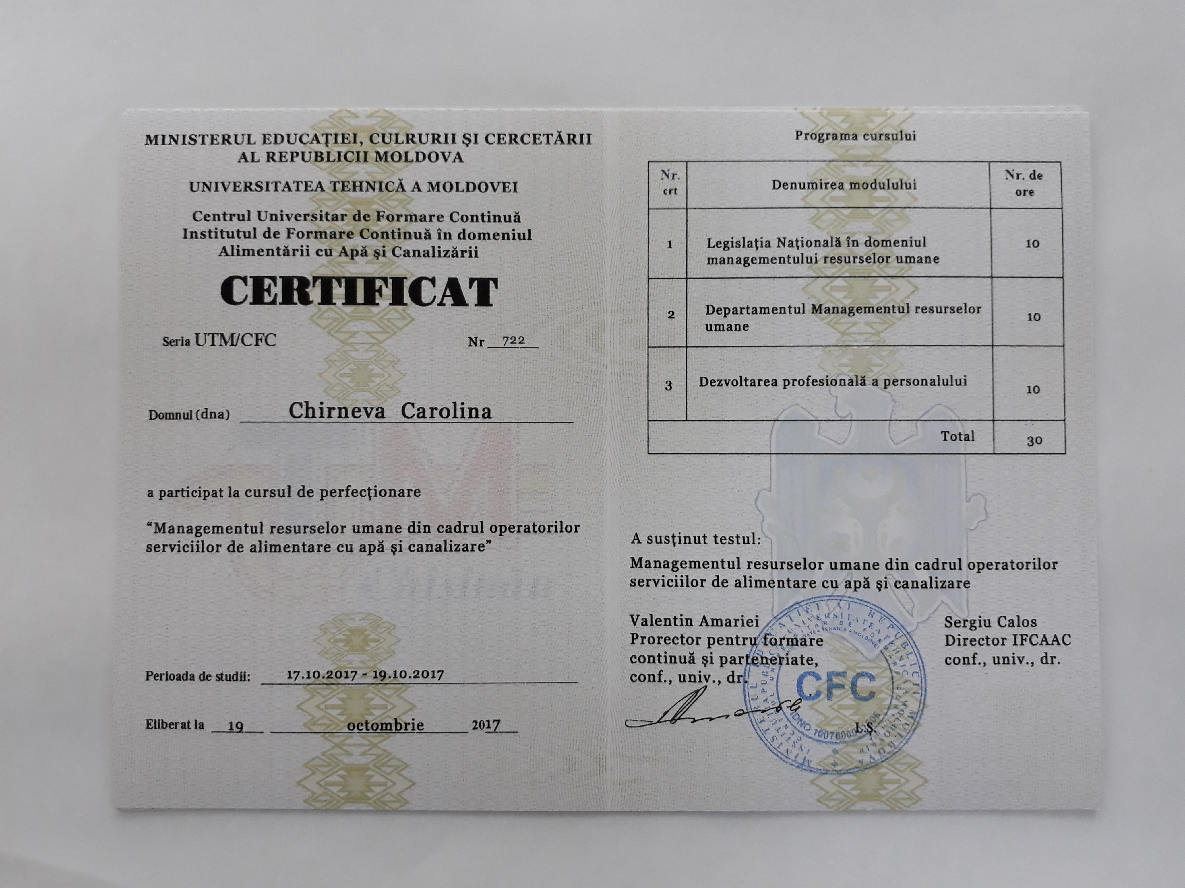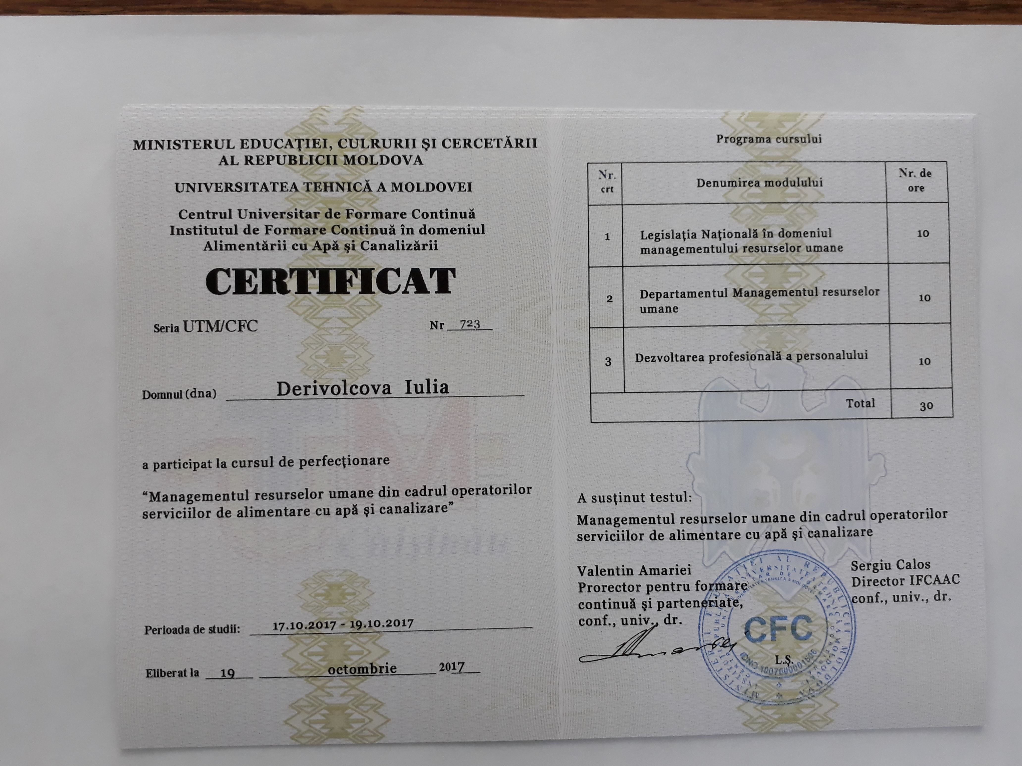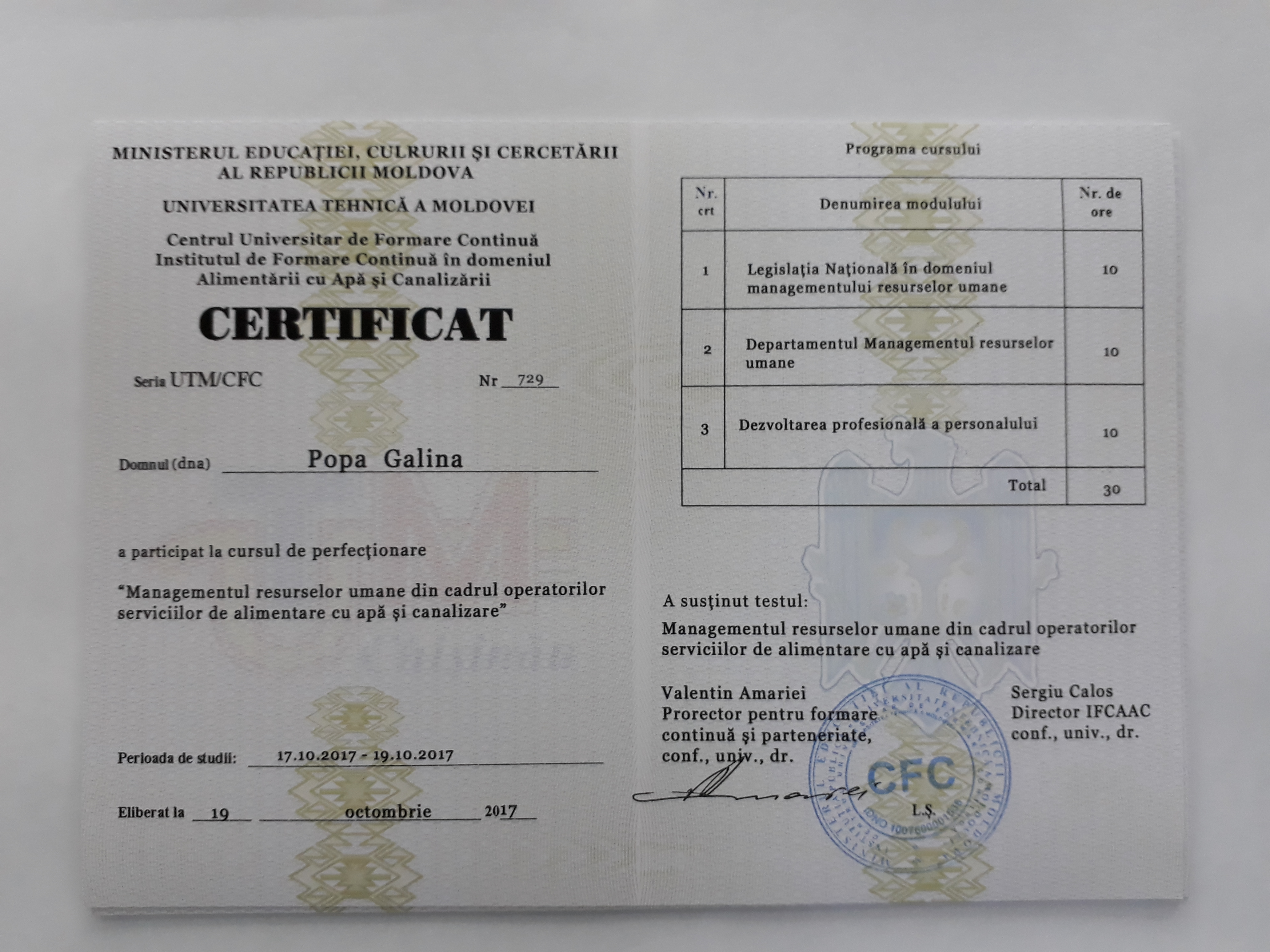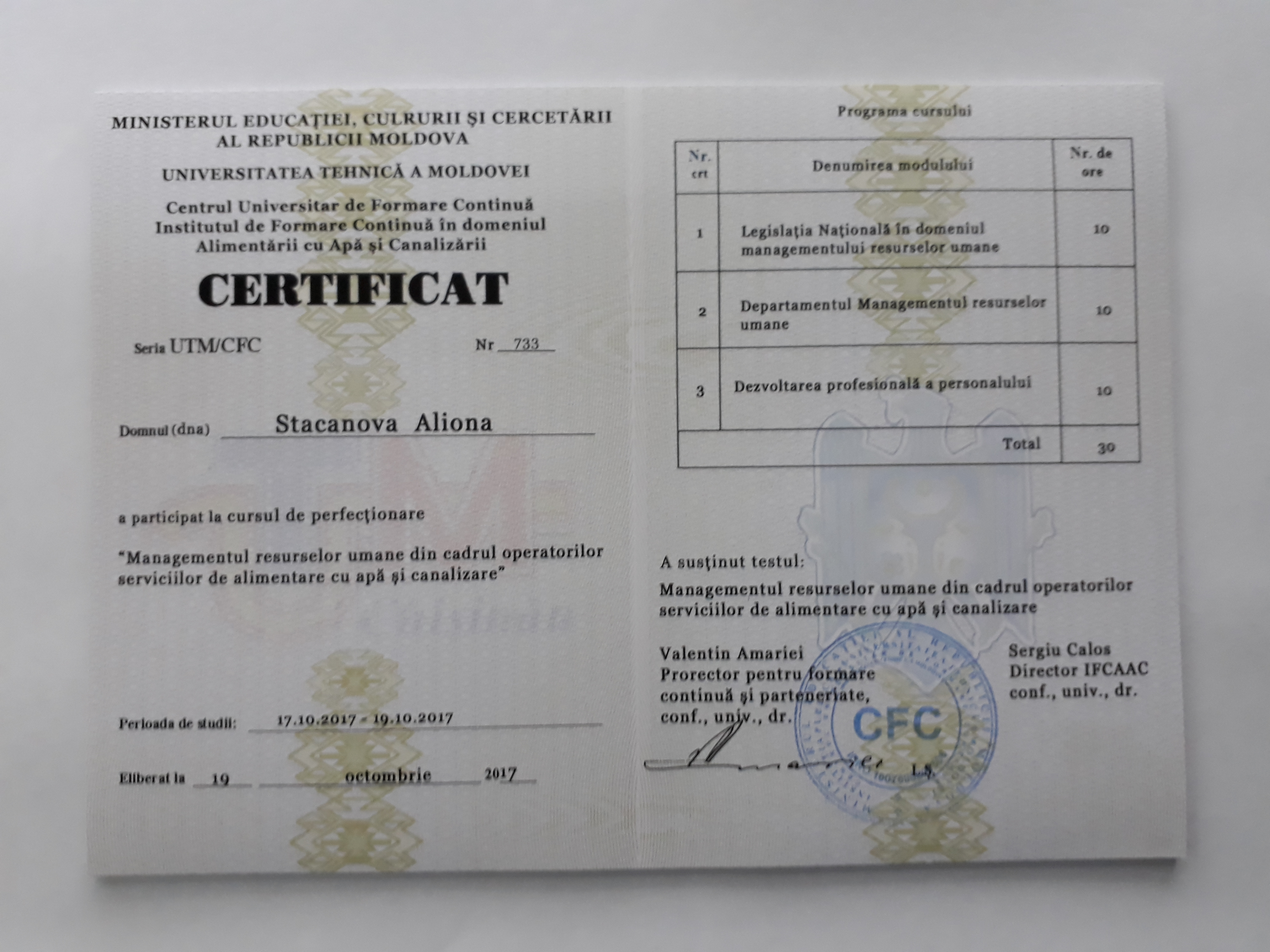 Direcția executivă a Asociației Moldova Apă-Canal (AMAC) în colaborare cu Institutul de Formare Continuă în domeniul Alimentării cu Apă și de Canalizare pentru membri AMAC (IFCAAC), cu suportul financiar al Agenției de Cooperare Internațională a Germaniei (GIZ), în perioada 17-18-19 octombrie 2017, a organizat cursul de instruire pentru Modulul 12: Managementul resurselor umane în cadrul operatorilor serviciilor de alimentare cu apă și de canalizare. Grupul 2 (limba rusă).