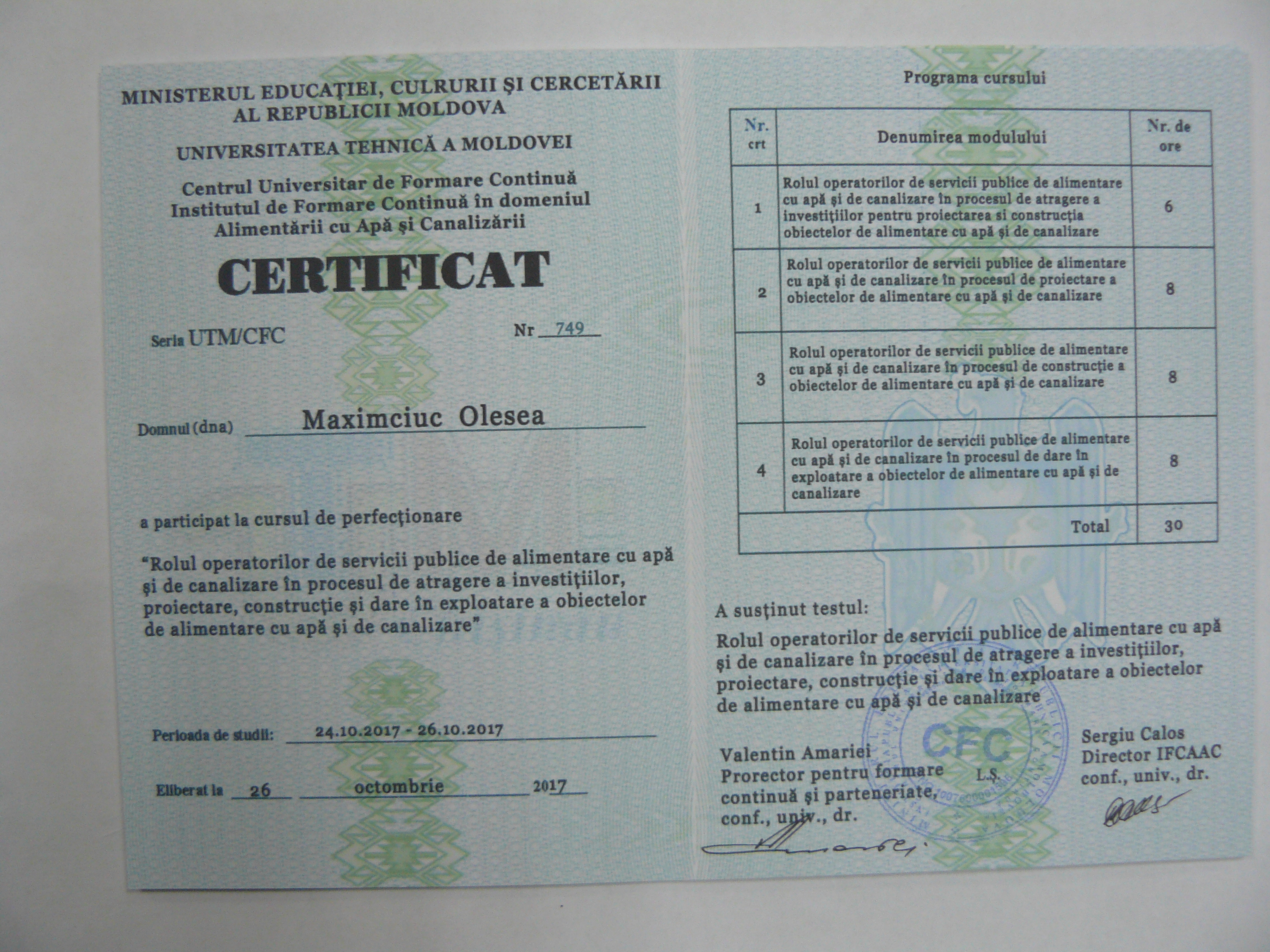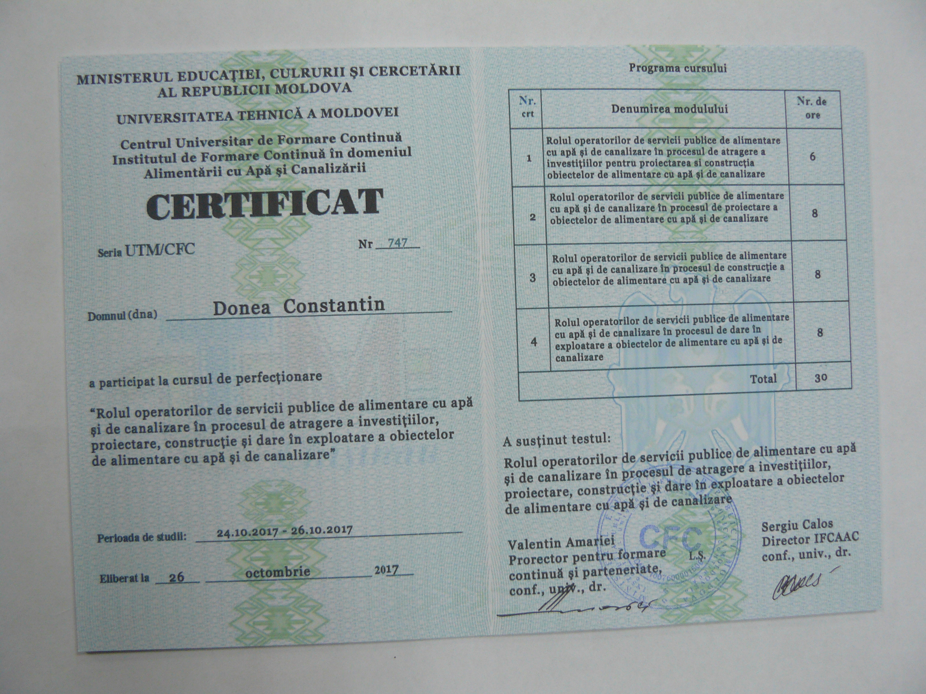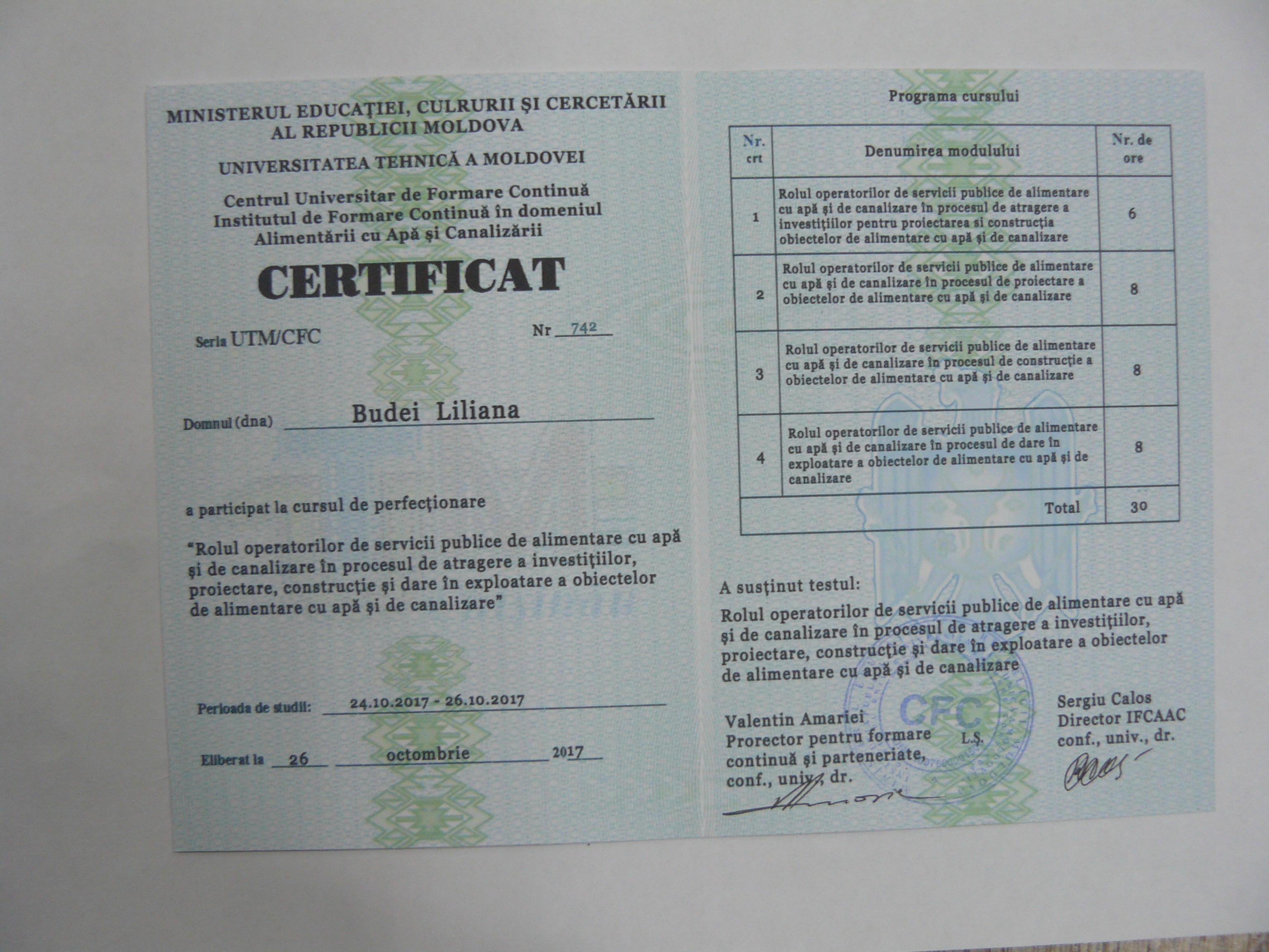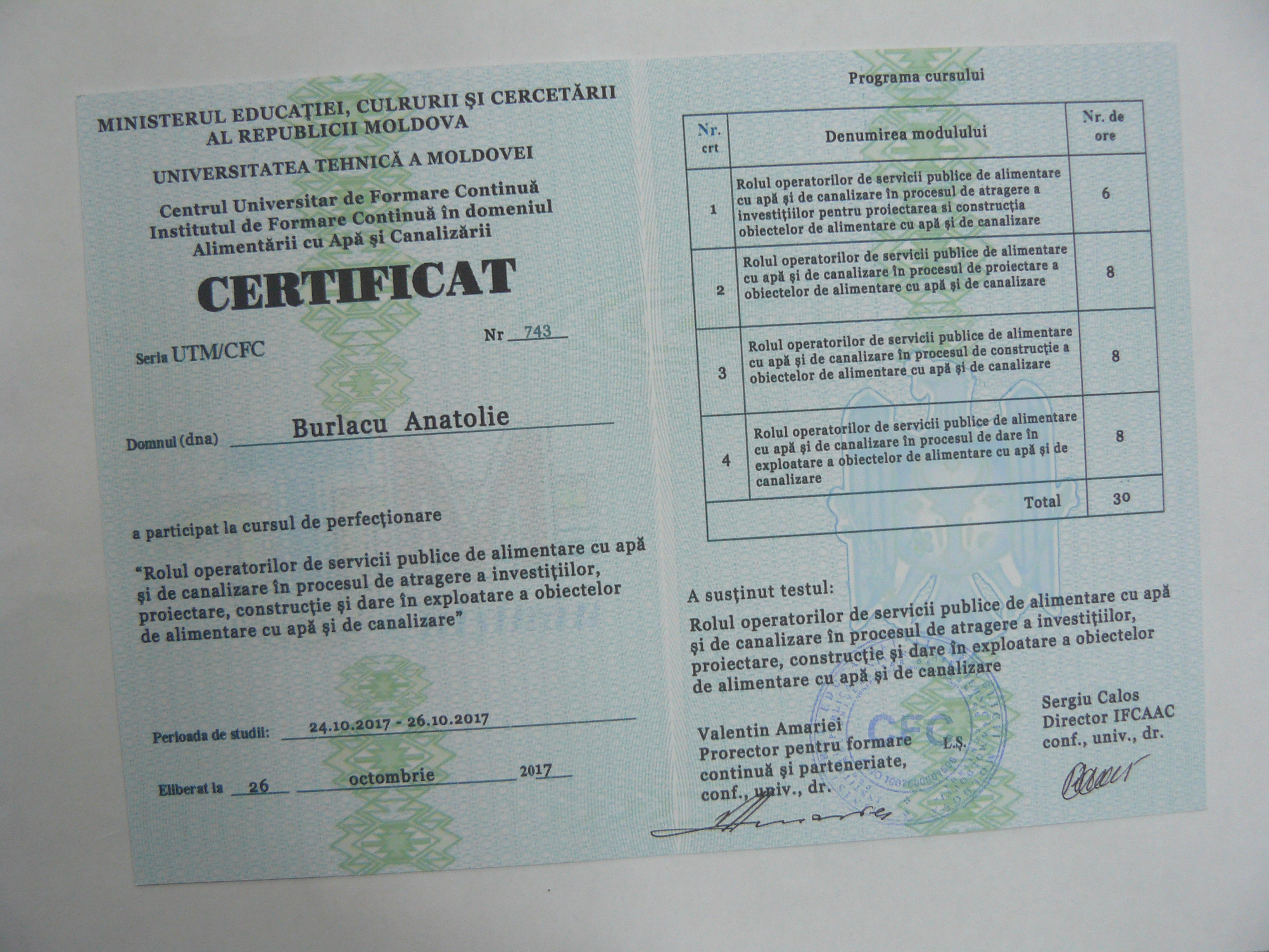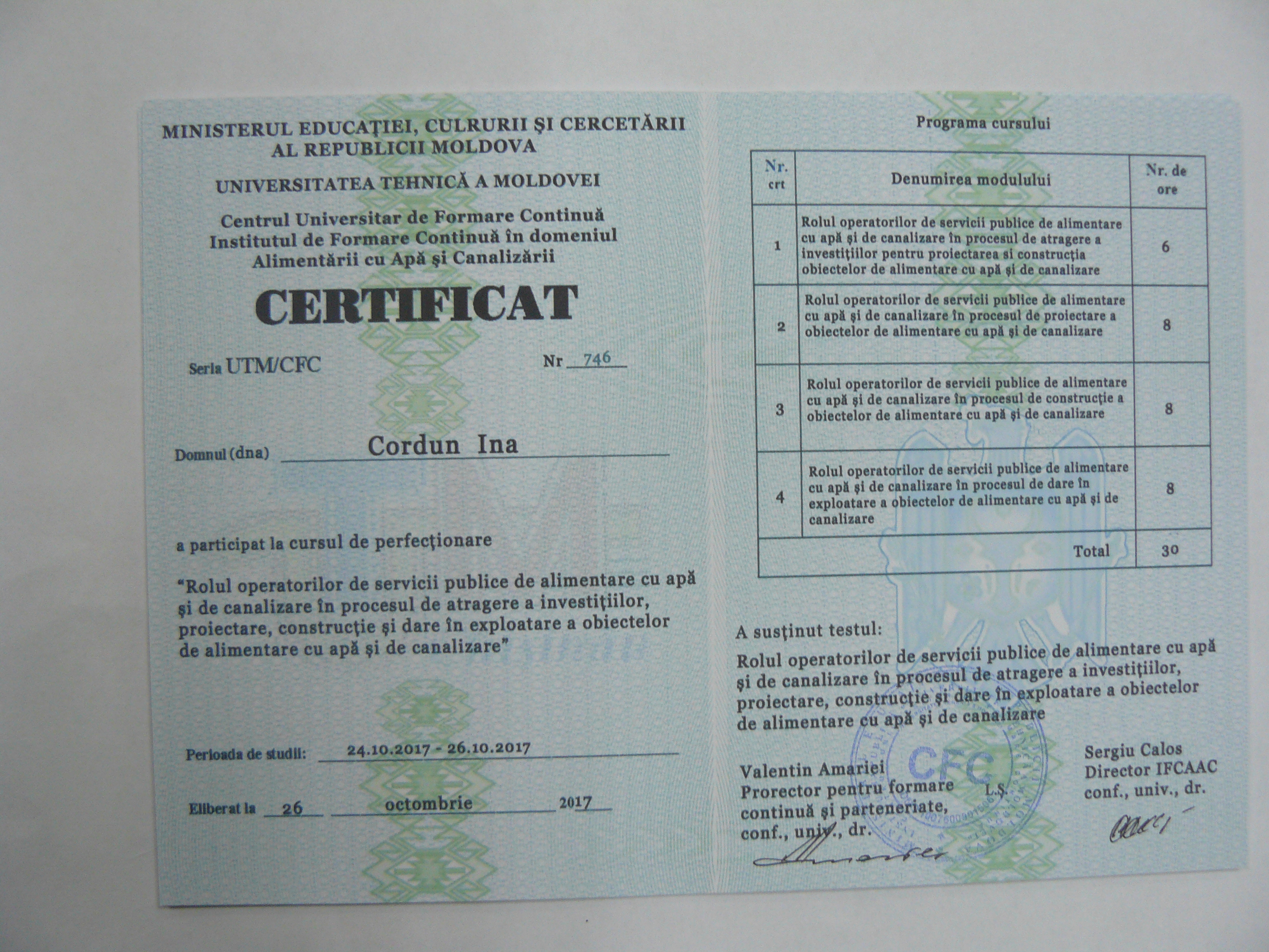 Direcția executivă a Asociației Moldova Apă-Canal (AMAC) în colaborare cu Institutul de Formare Continuă în domeniul Alimentării cu Apă și de Canalizare pentru membri AMAC (IFCAAC), cu suportul financiar al Agenției de Cooperare Internațională a Germaniei (GIZ), în perioada 24-25-26 octombrie 2017, a organizat cursul de instruire pentru Modulul 10: Rolul operatorilor de servicii publice de alimentare cu apă și de canalizare în procesul de atragere a investițiilor, proiectare, construcție și dare în exploatare a obiectelor de alimentare cu apă și de canalizare. Grupul 2 (limba română).