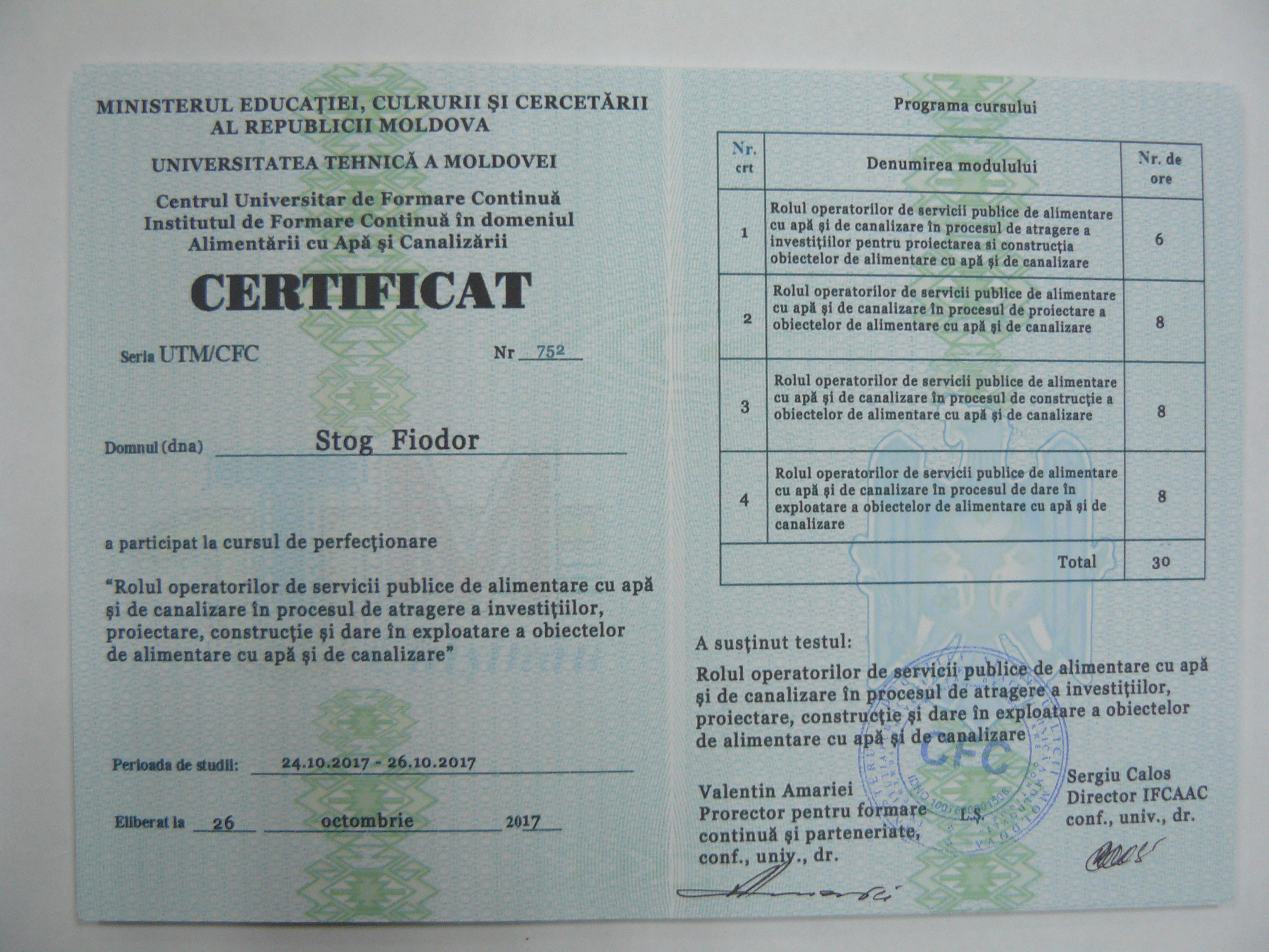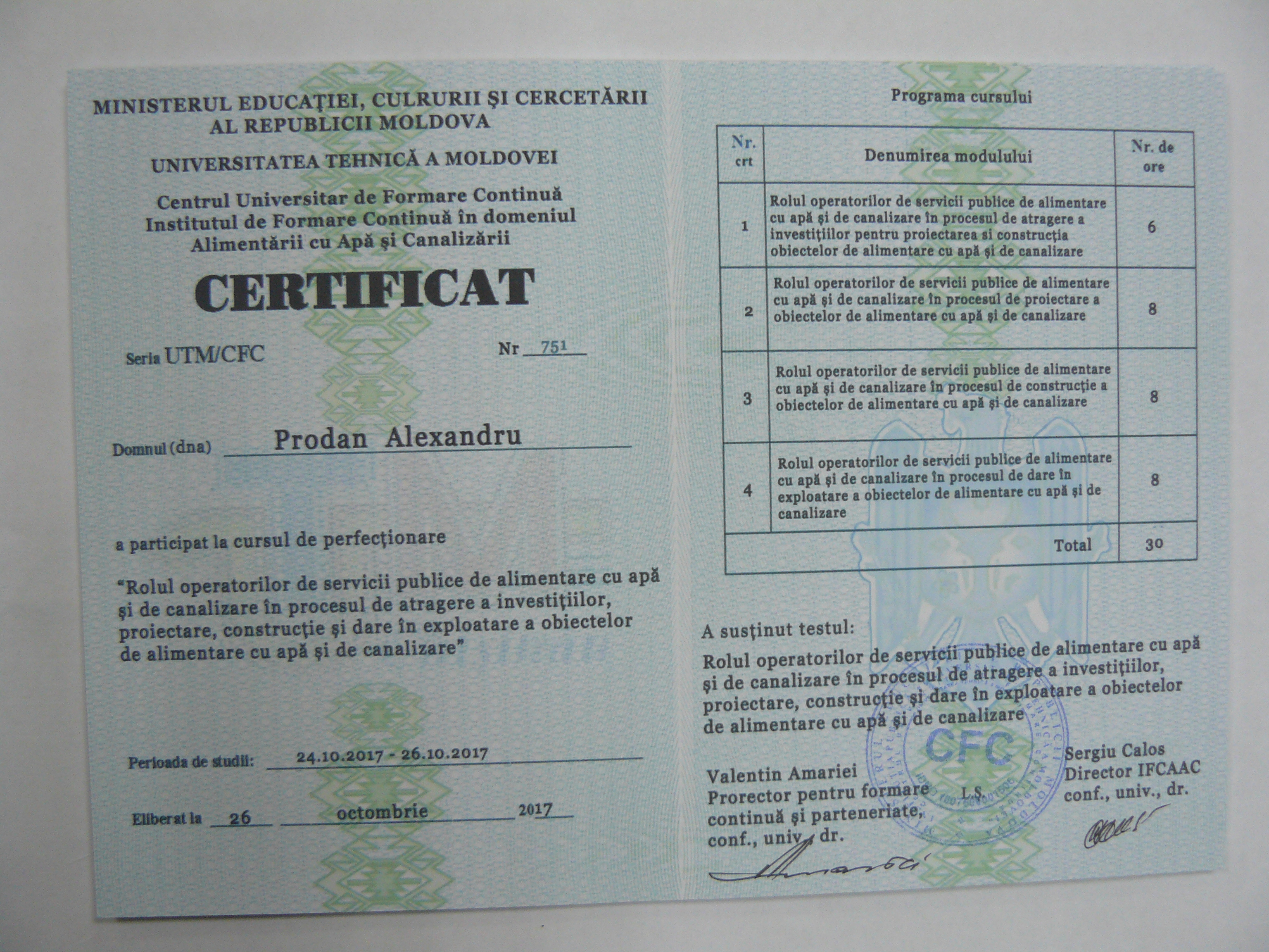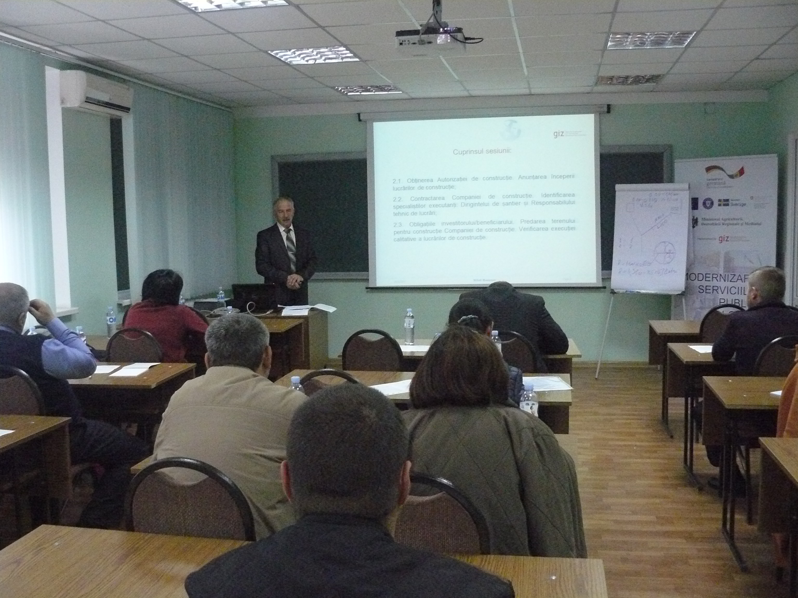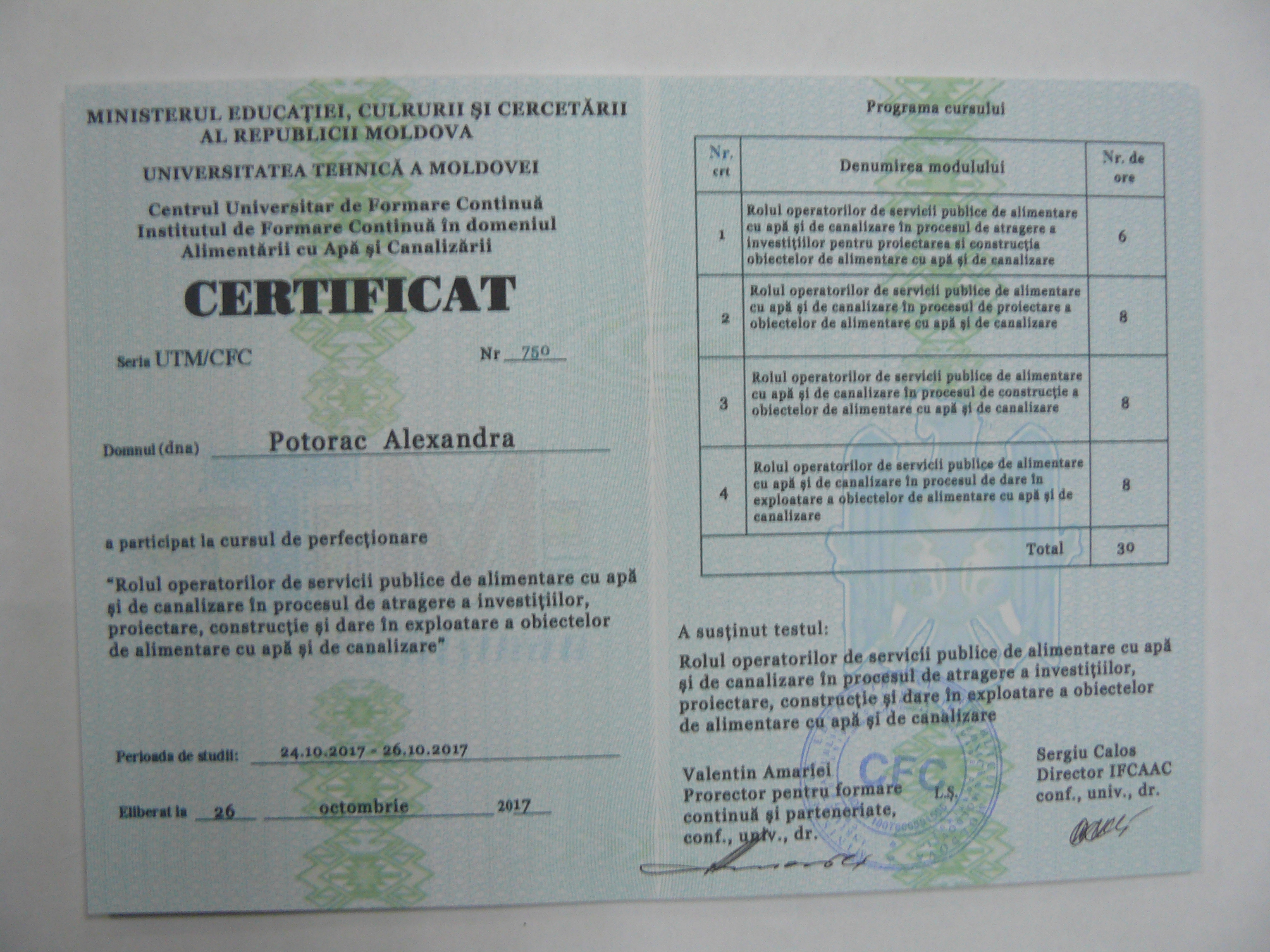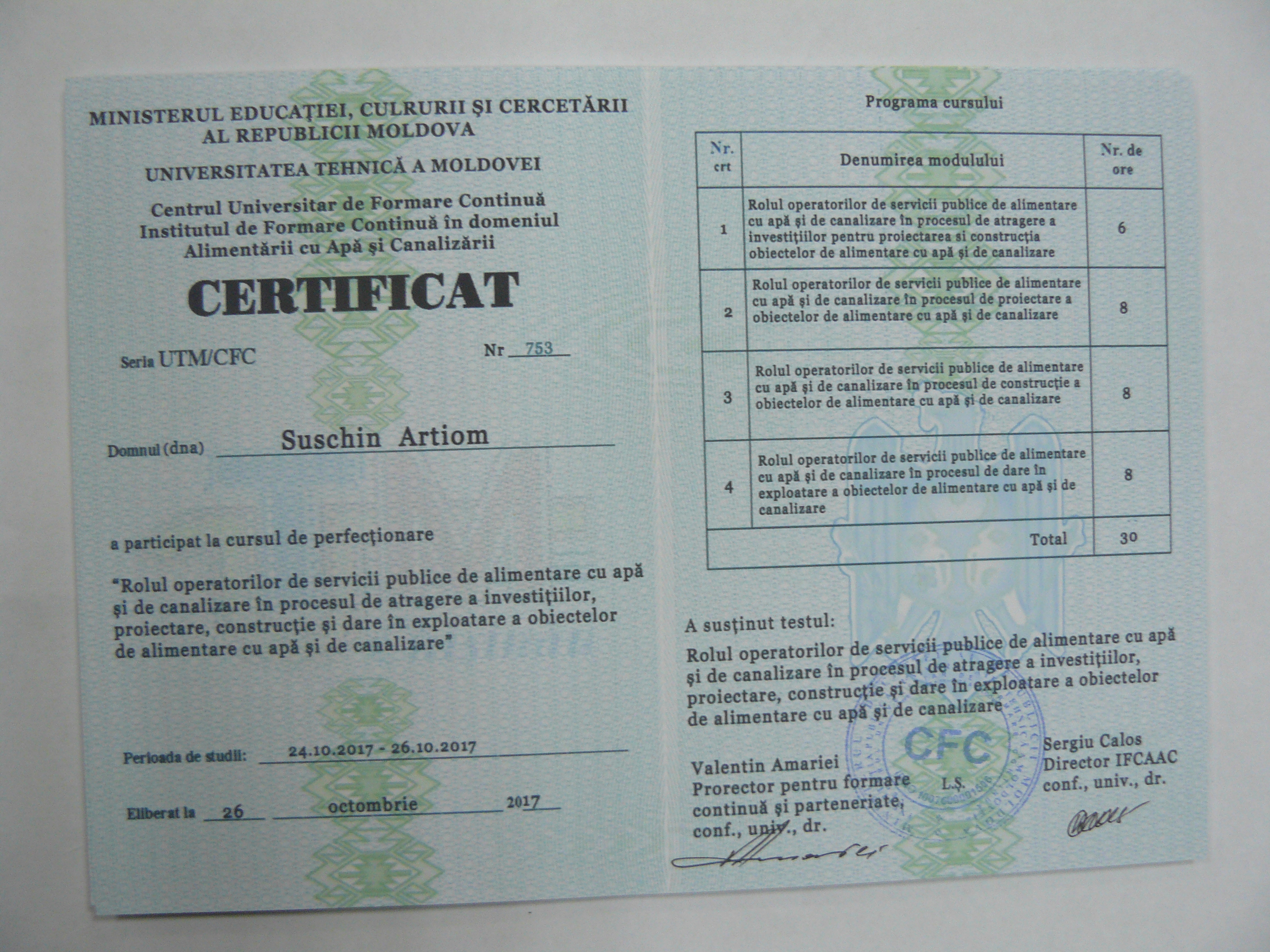 Direcția executivă a Asociației Moldova Apă-Canal (AMAC) în colaborare cu Institutul de Formare Continuă în domeniul Alimentării cu Apă și de Canalizare pentru membri AMAC (IFCAAC), cu suportul financiar al Agenției de Cooperare Internațională a Germaniei (GIZ), în perioada 24-25-26 octombrie 2017, a organizat cursul de instruire pentru Modulul 10: Rolul operatorilor de servicii publice de alimentare cu apă și de canalizare în procesul de atragere a investițiilor, proiectare, construcție și dare în exploatare a obiectelor de alimentare cu apă și de canalizare. Grupul 2 (limba română).