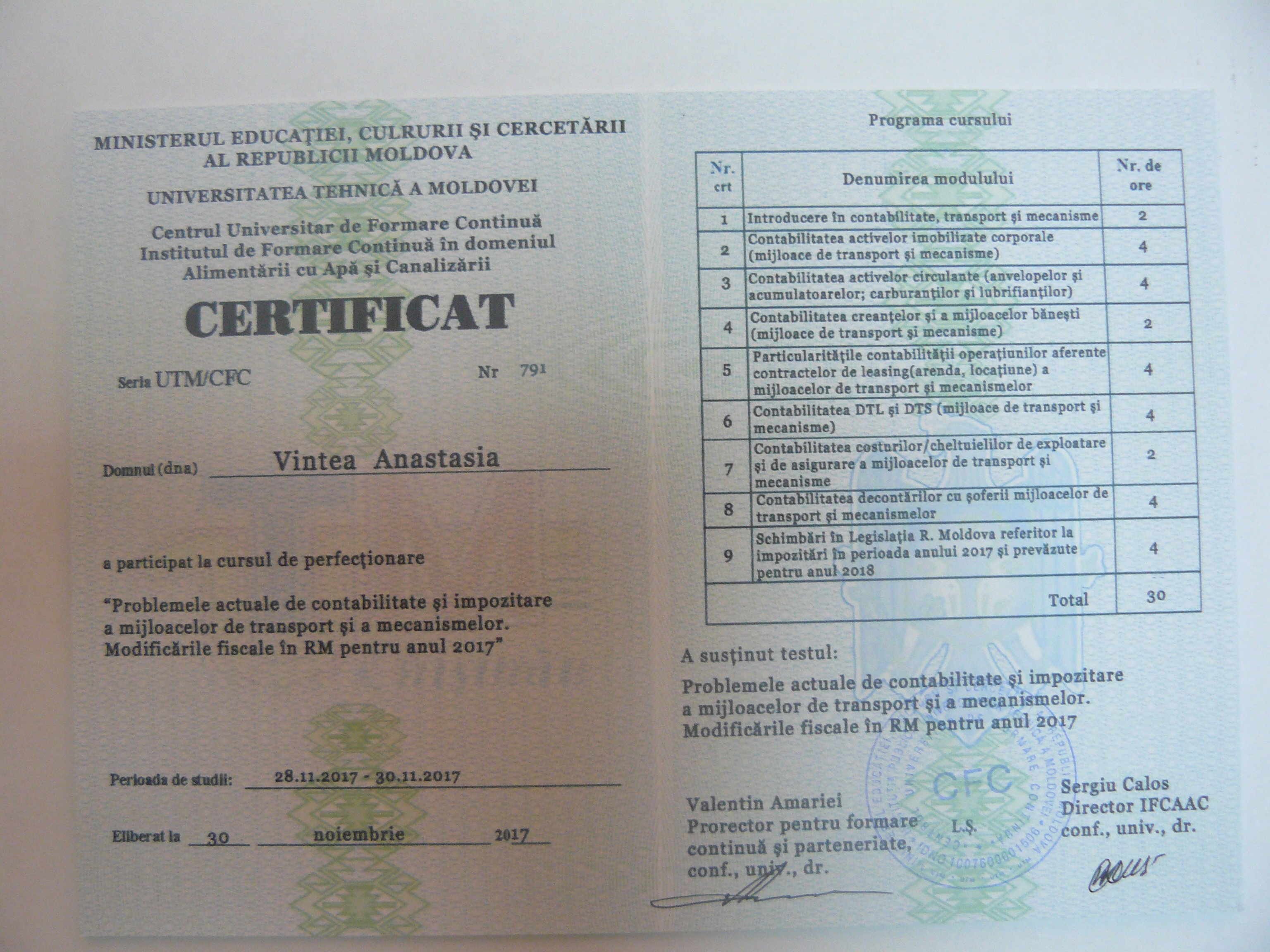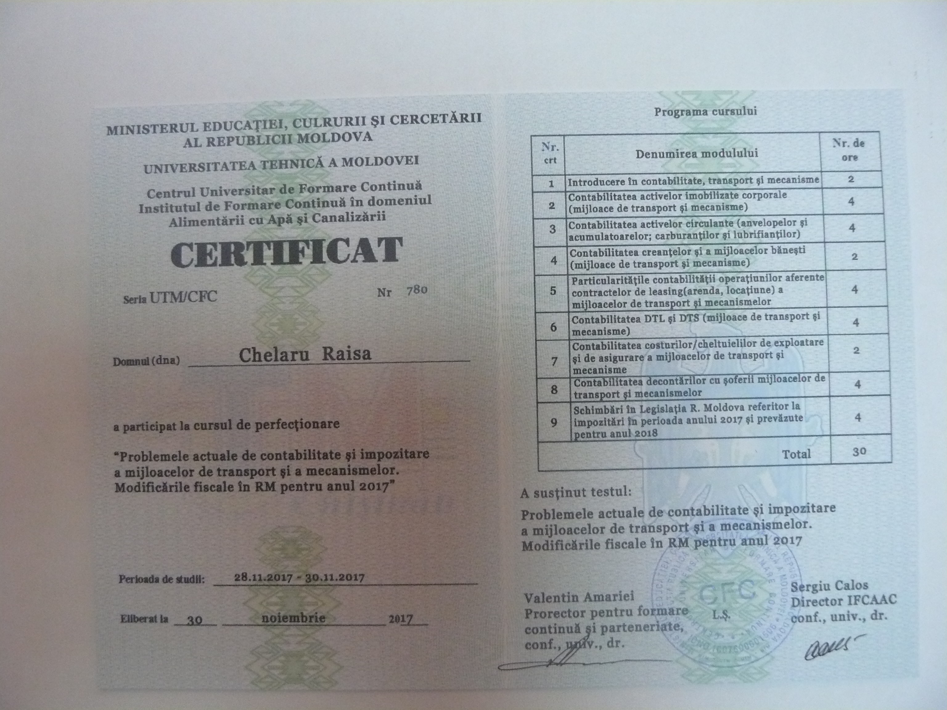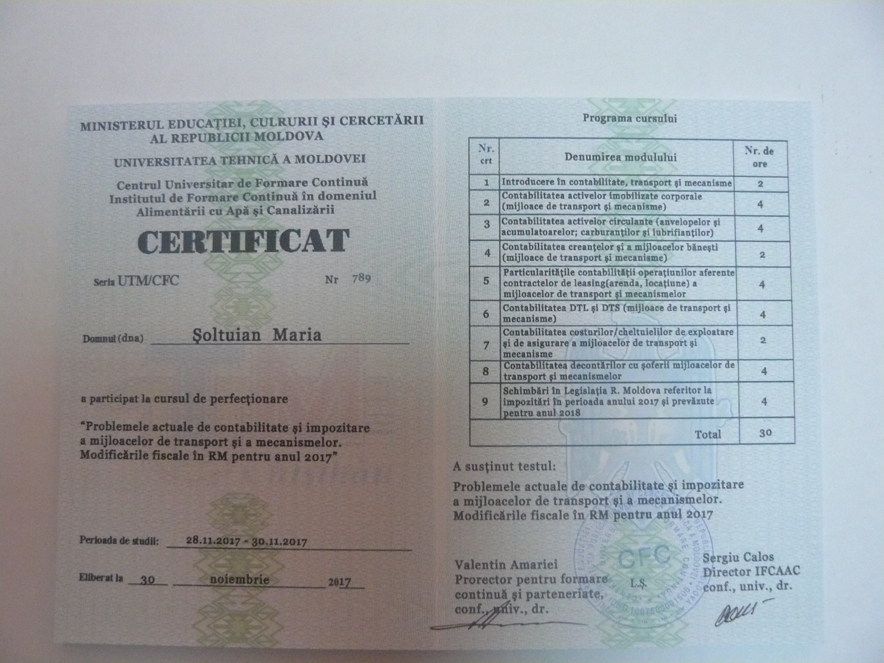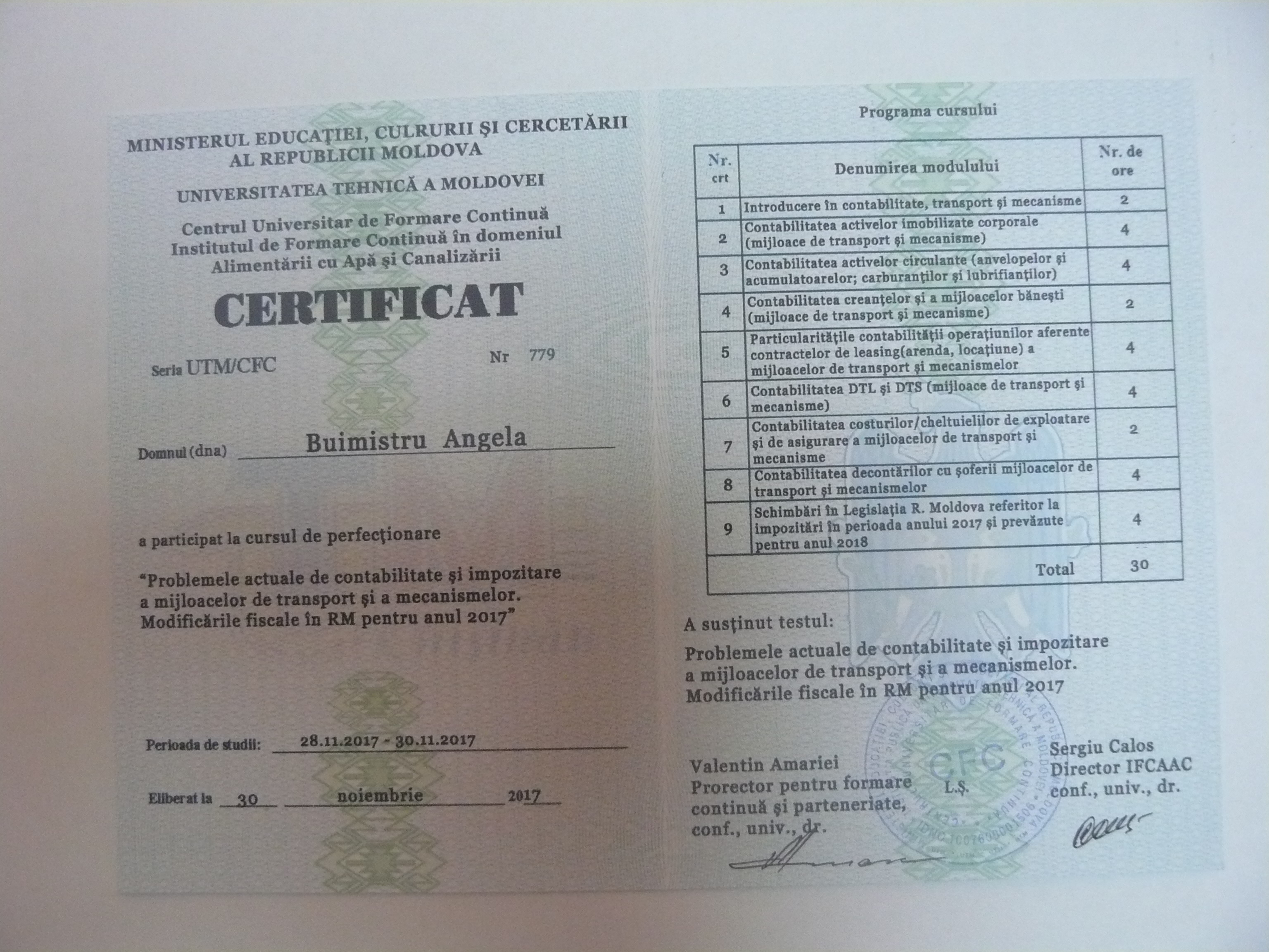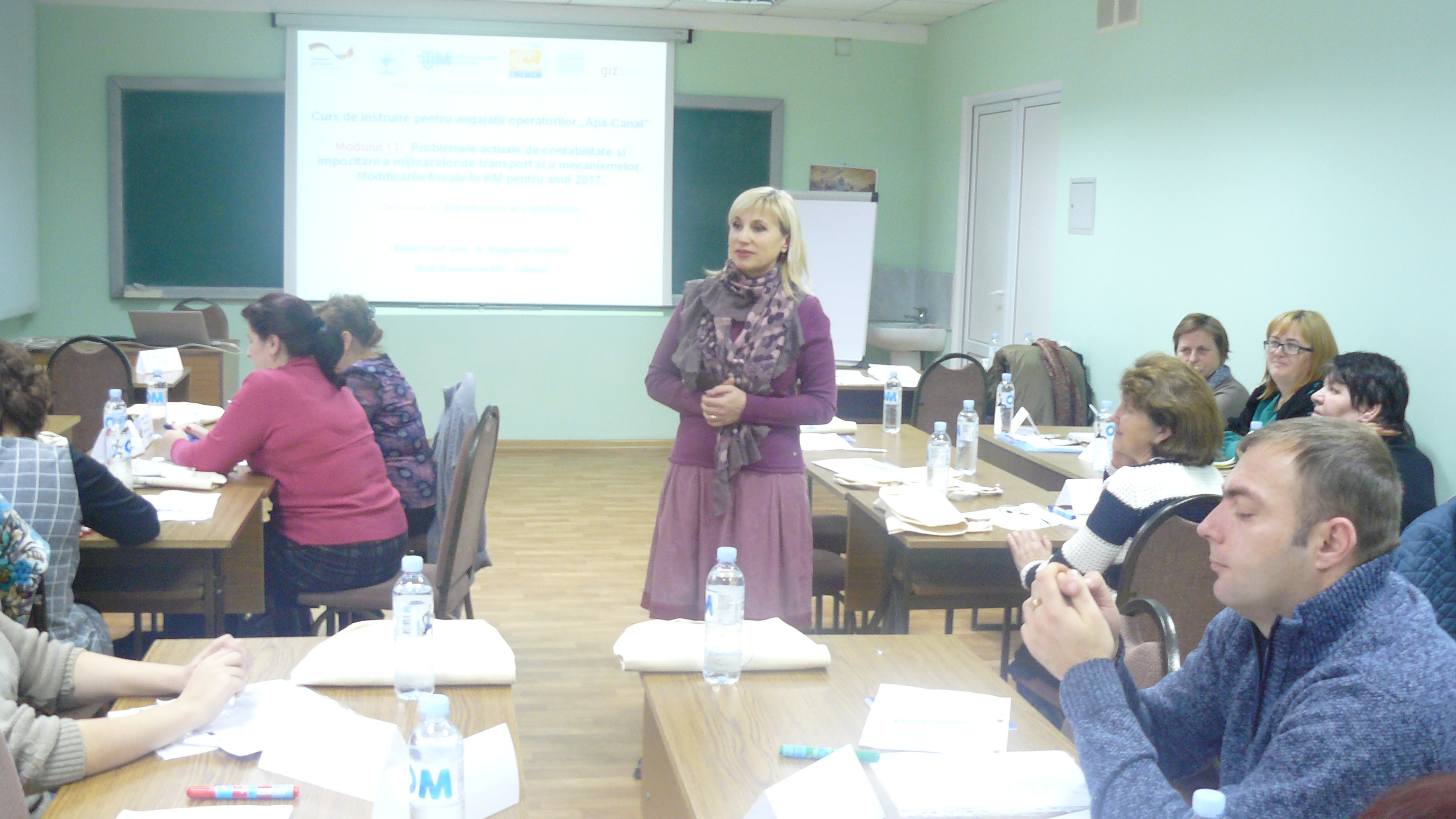 La data de 28-29-30 noiembrie 2017, în incita Institutului de Formare Continuă din domeniul Alemtării cu Apă și Canalizare, pentru membrii AMAC (IFCAAC), sa desfășurat cursul de instruire pentru Modulul ”Problemele actuale de contabilitate și impozitare a mijloacelor de transport și a mecanismelor. Modificările fiscale în RM pentru anul 2017”. Cursul de instruire este organizat de către Asociația MoldovaApă-Canal în colaborare cu IFCAAC, cu suportul financiar a Agenției de Cooperare Internațională a Germaniei (GIZ). Grupul 1(limba română).