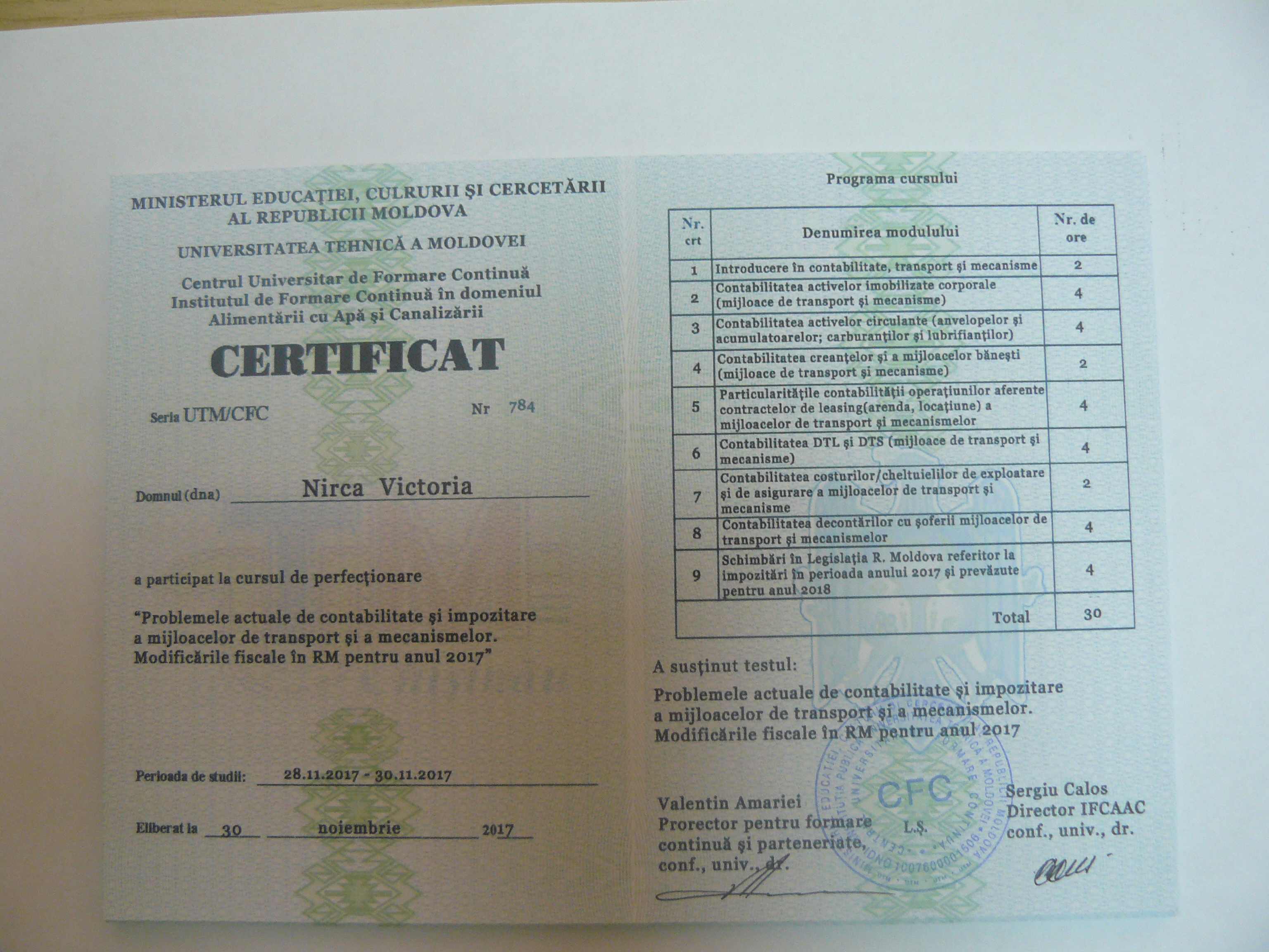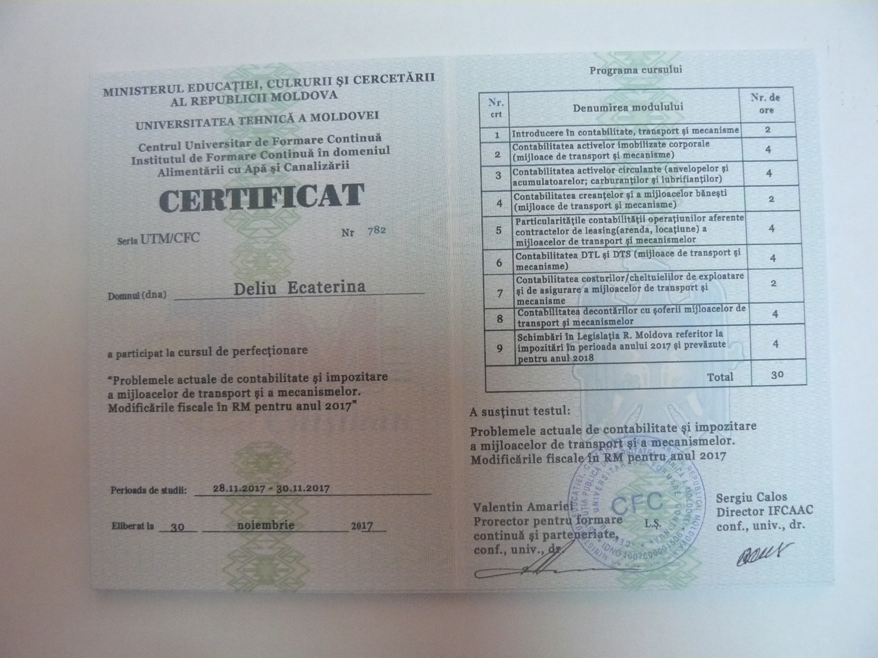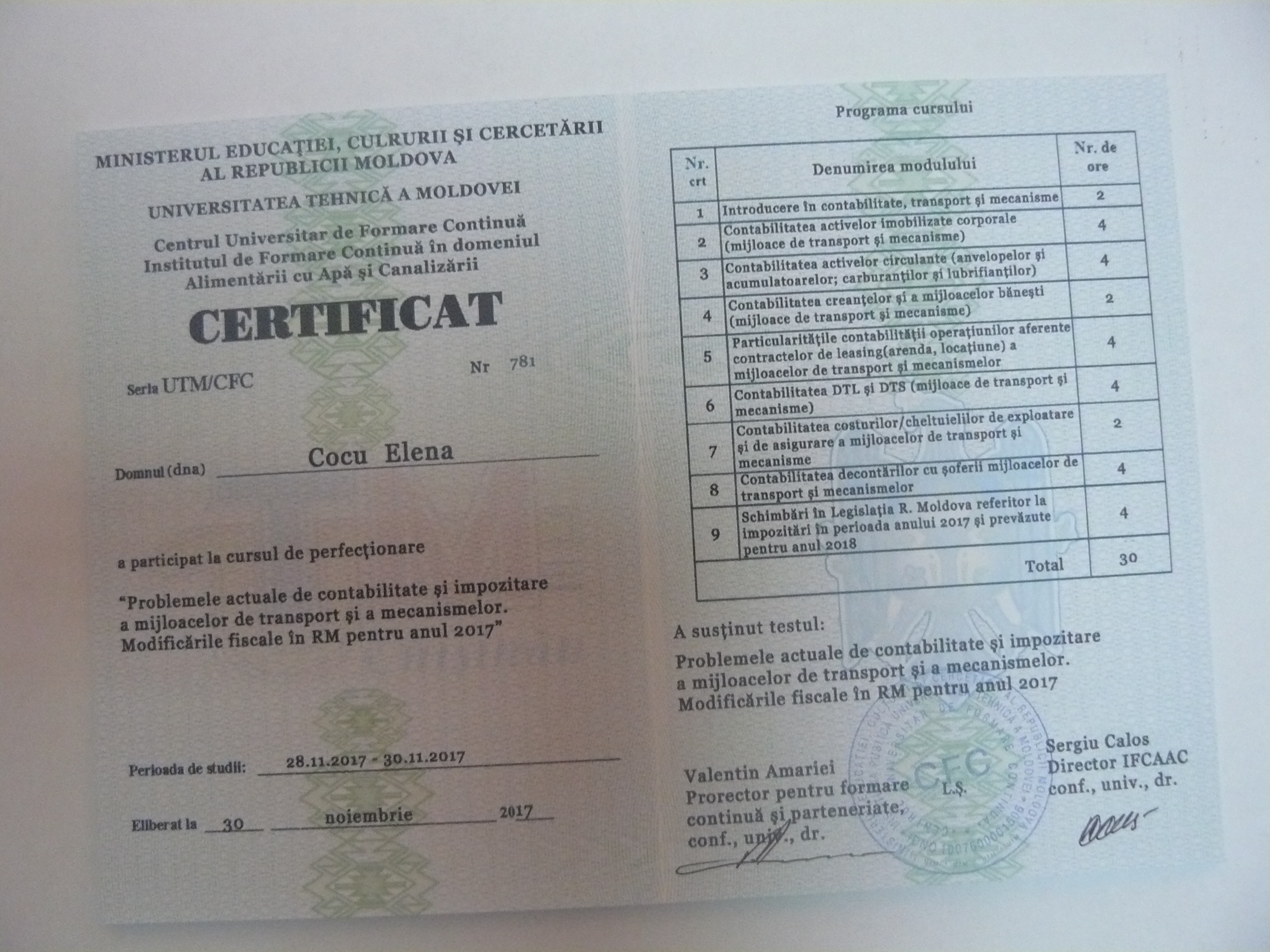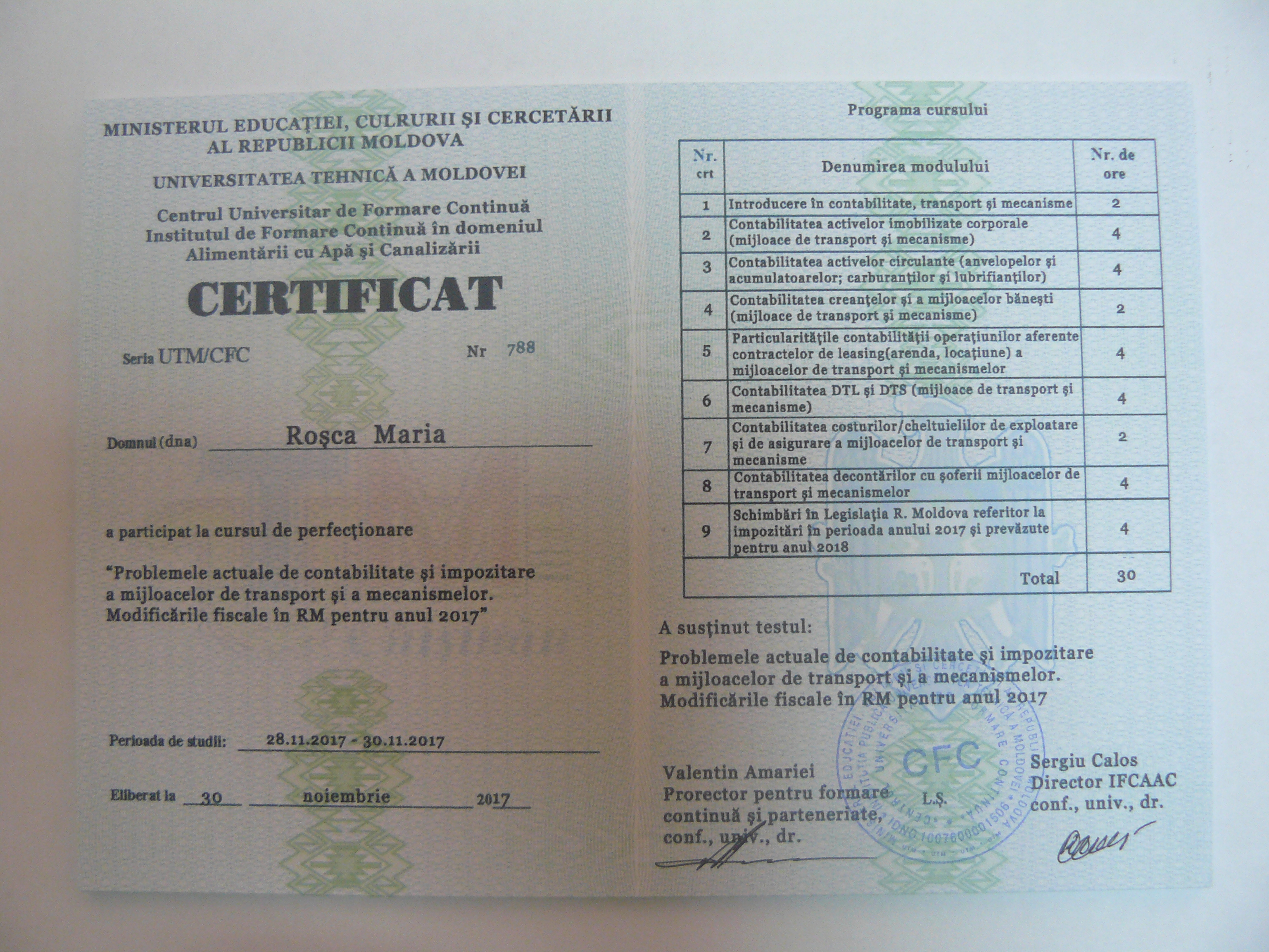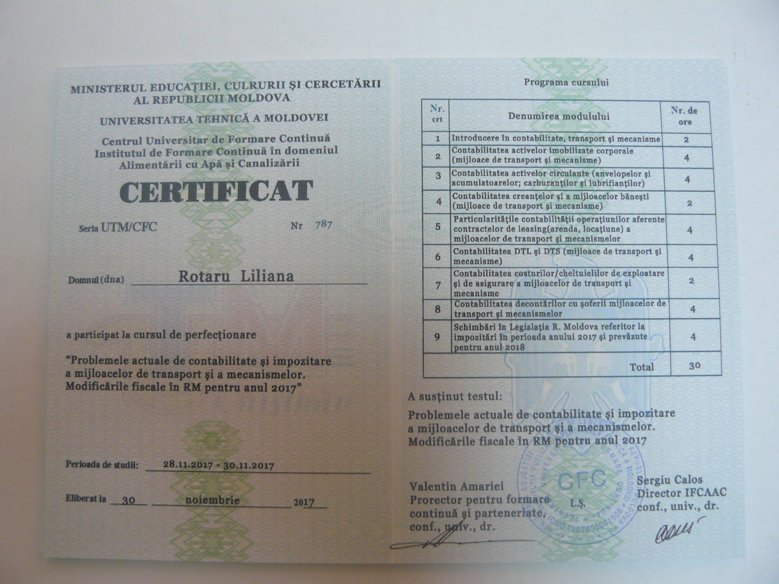 La data de 28-29-30 noiembrie 2017, în incita Institutului de Formare Continuă din domeniul Alemtării cu Apă și Canalizare, pentru membrii AMAC (IFCAAC), sa desfășurat cursul de instruire pentru Modulul ”Problemele actuale de contabilitate și impozitare a mijloacelor de transport și a mecanismelor. Modificările fiscale în RM pentru anul 2017”. Cursul de instruire este organizat de către Asociația MoldovaApă-Canal în colaborare cu IFCAAC, cu suportul financiar a Agenției de Cooperare Internațională a Germaniei (GIZ). Grupul 1(limba română).
