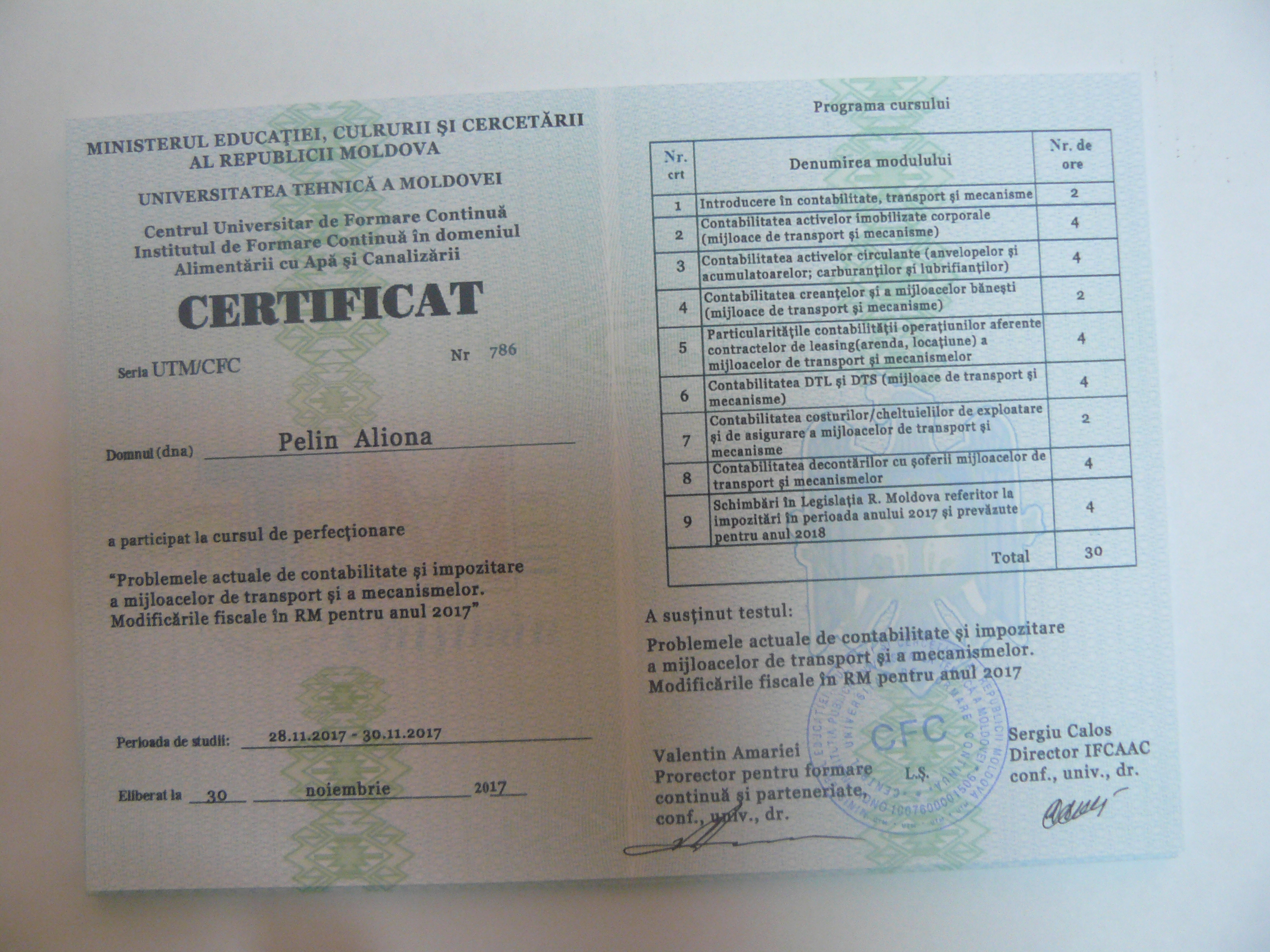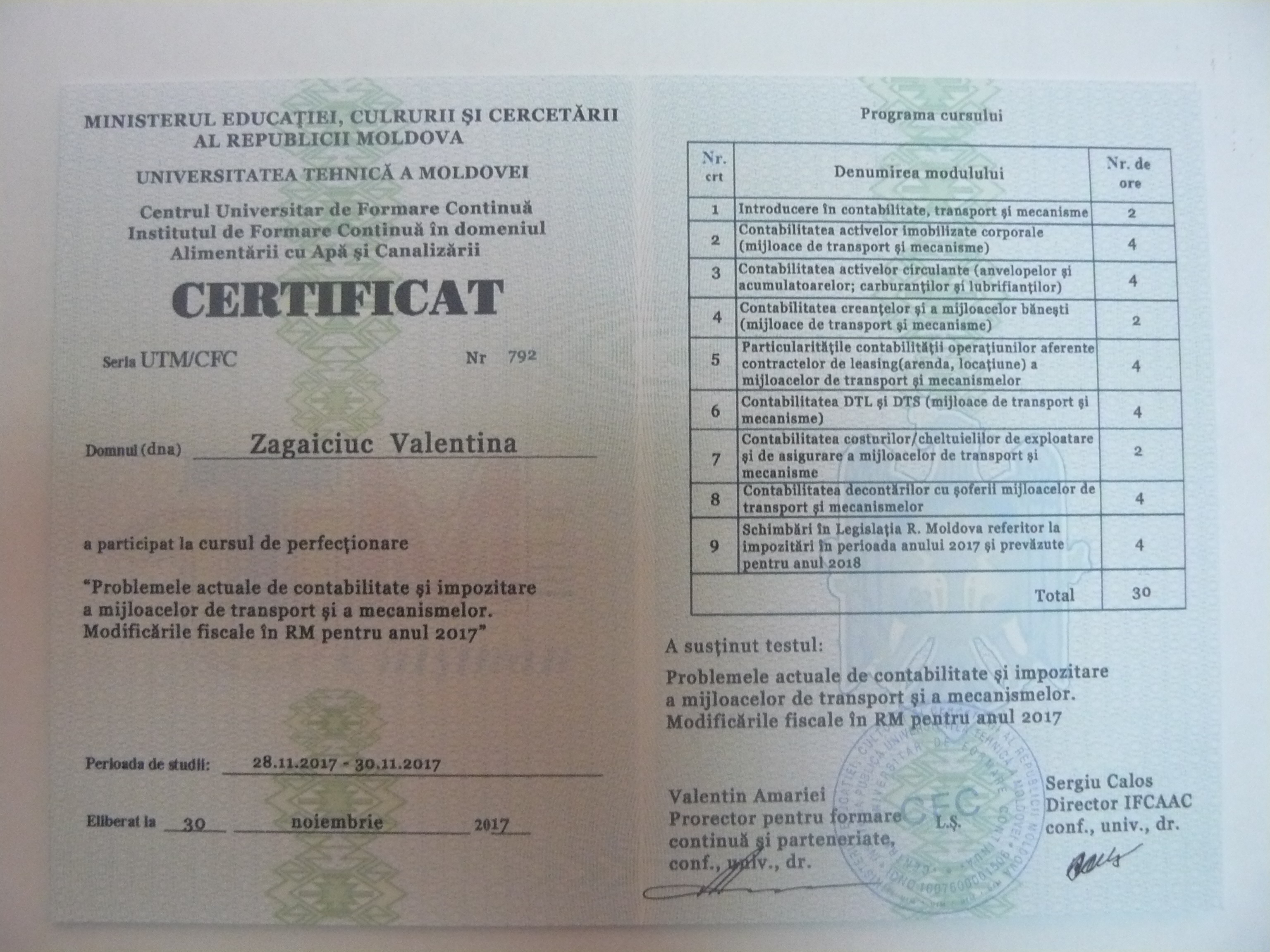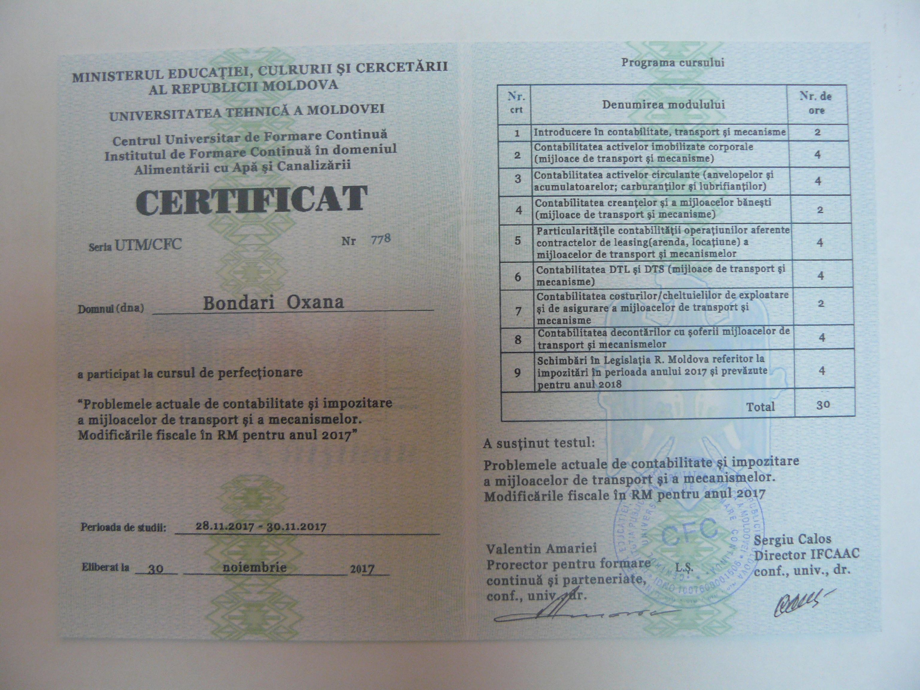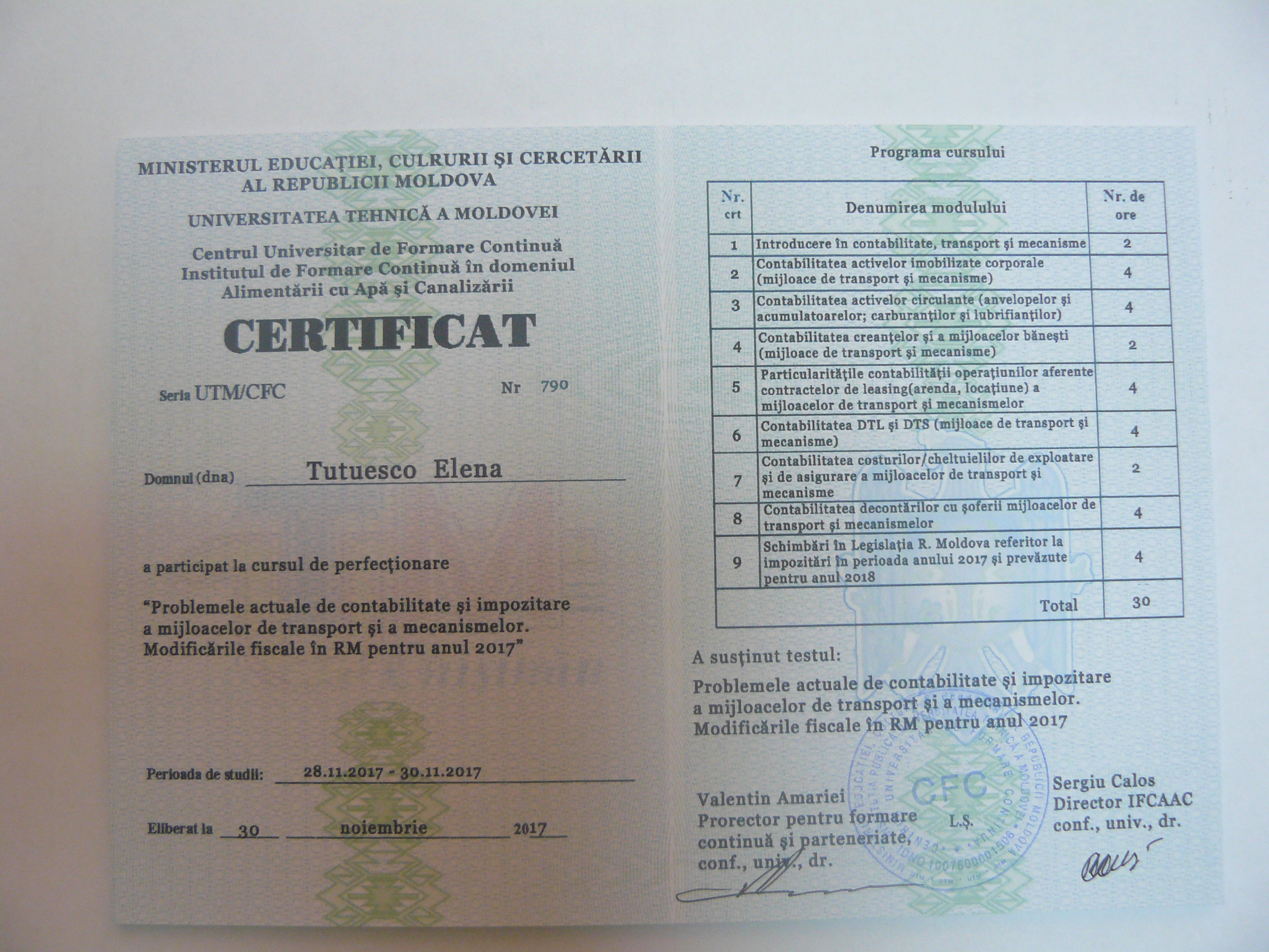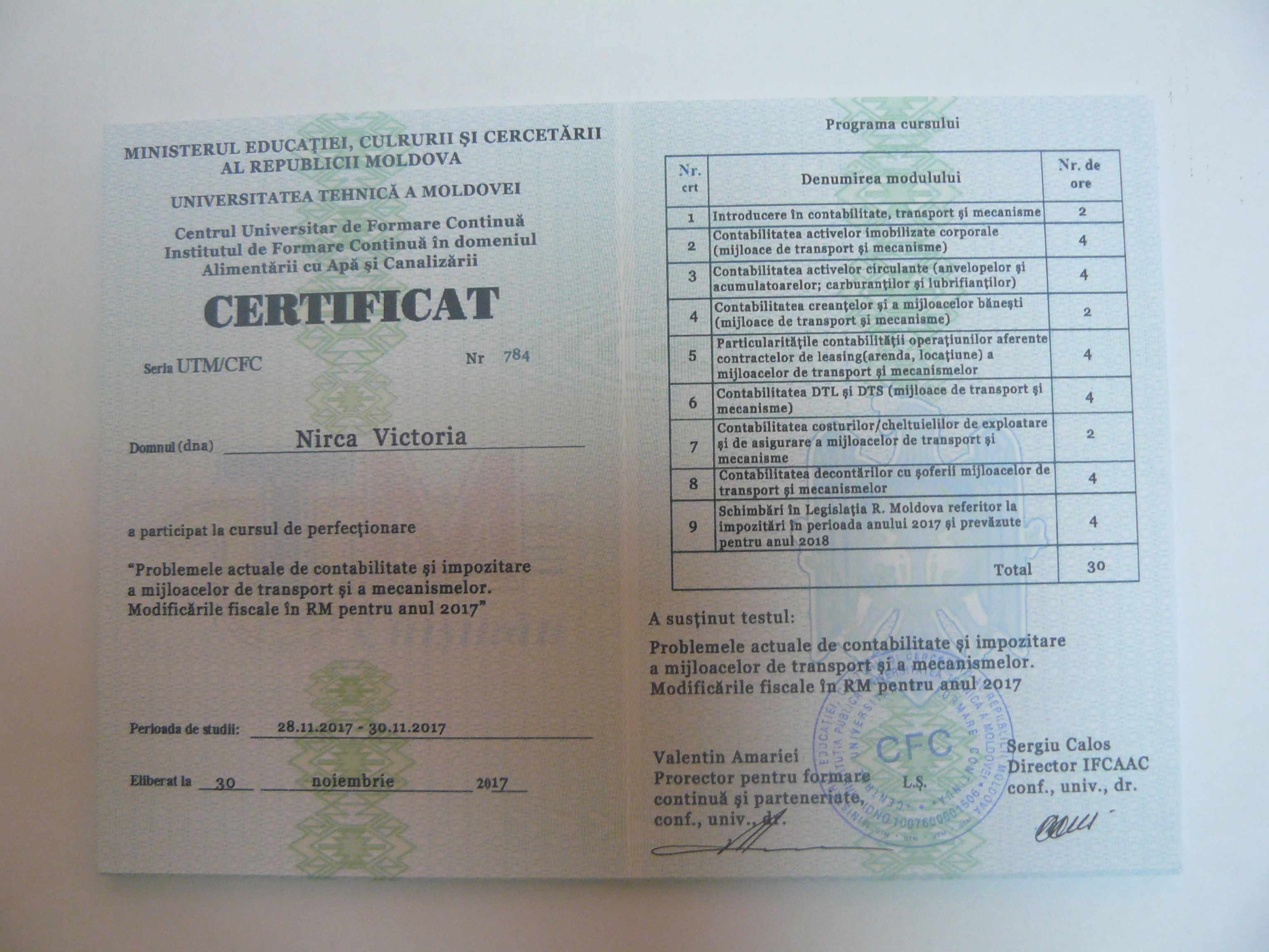 La data de 28-29-30 noiembrie 2017, în incita Institutului de Formare Continuă din domeniul Alemtării cu Apă și Canalizare, pentru membrii AMAC (IFCAAC), sa desfășurat cursul de instruire pentru Modulul ”Problemele actuale de contabilitate și impozitare a mijloacelor de transport și a mecanismelor. Modificările fiscale în RM pentru anul 2017”. Cursul de instruire este organizat de către Asociația MoldovaApă-Canal în colaborare cu IFCAAC, cu suportul financiar a Agenției de Cooperare Internațională a Germaniei (GIZ). Grupul 1(limba română).